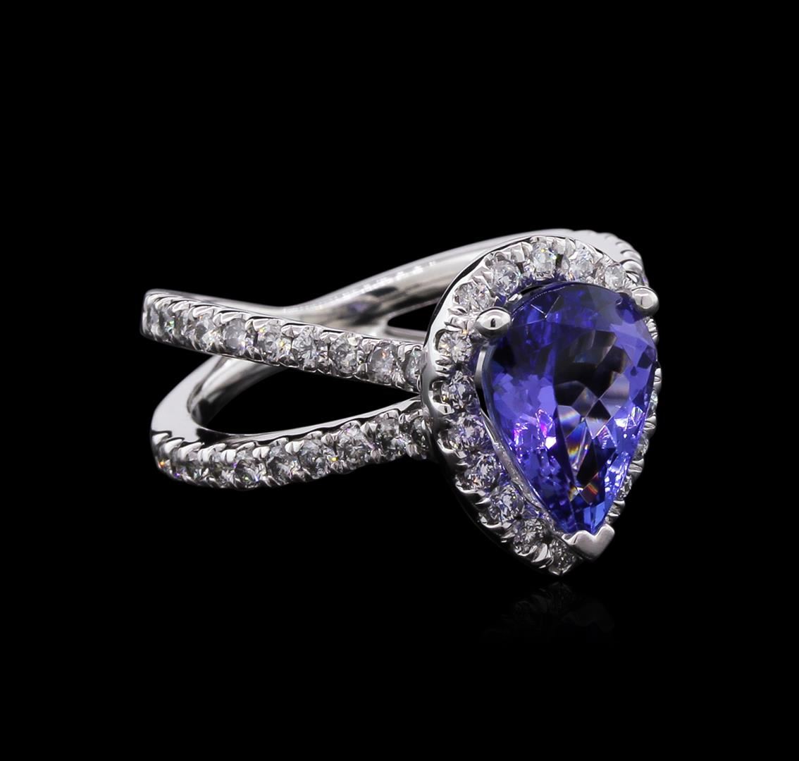 One electronically tested 14KT white gold lady's cast fashion ring with a split shank halo with a bright polish finish. The featured lady's ring has a shank measuring 2.67 millimeters wide. Identified with markings of "14K". Condition is new, good workmanship. Containing: One prong set pear modified brilliant cut natural tanzanite, measuring 10.18 x 7.61 x 4.75mm, approximate weight of 2.40ct., clarity is eye clean, type I, medium, very slightly grayish, bluish violet color, (GIA bV 5/3), cut is very good. Transmitting light with no distortion, transparent. Colored gemstones are presumed to have been subjected to commonly used enhancement processes. Graded in the setting. Fifty-Eight split prong set round brilliant cut diamonds, measuring 1.60 - 1.40 x 0.98mm (depth est.) approximate total weight of 58 Stones = 0.77ct. Graded in the setting. Clarity: VS-2 to SI-1. Color: H - I. Cut Good Seventeen prong set round brilliant cut diamonds, measuring 1.10 - 1.00 x 0.68mm (depth est.) approximate total weight of 17 Stones = 0.08ct. Graded in the setting. Clarity: SI-1 to SI-2. Color: H - Good. Total Weight of Colored Stones 2.40ct. Total Weight of Diamonds 0.85ct. Total Weight of Ring 6.80gm. GAS Appraised at $7,320.00.
