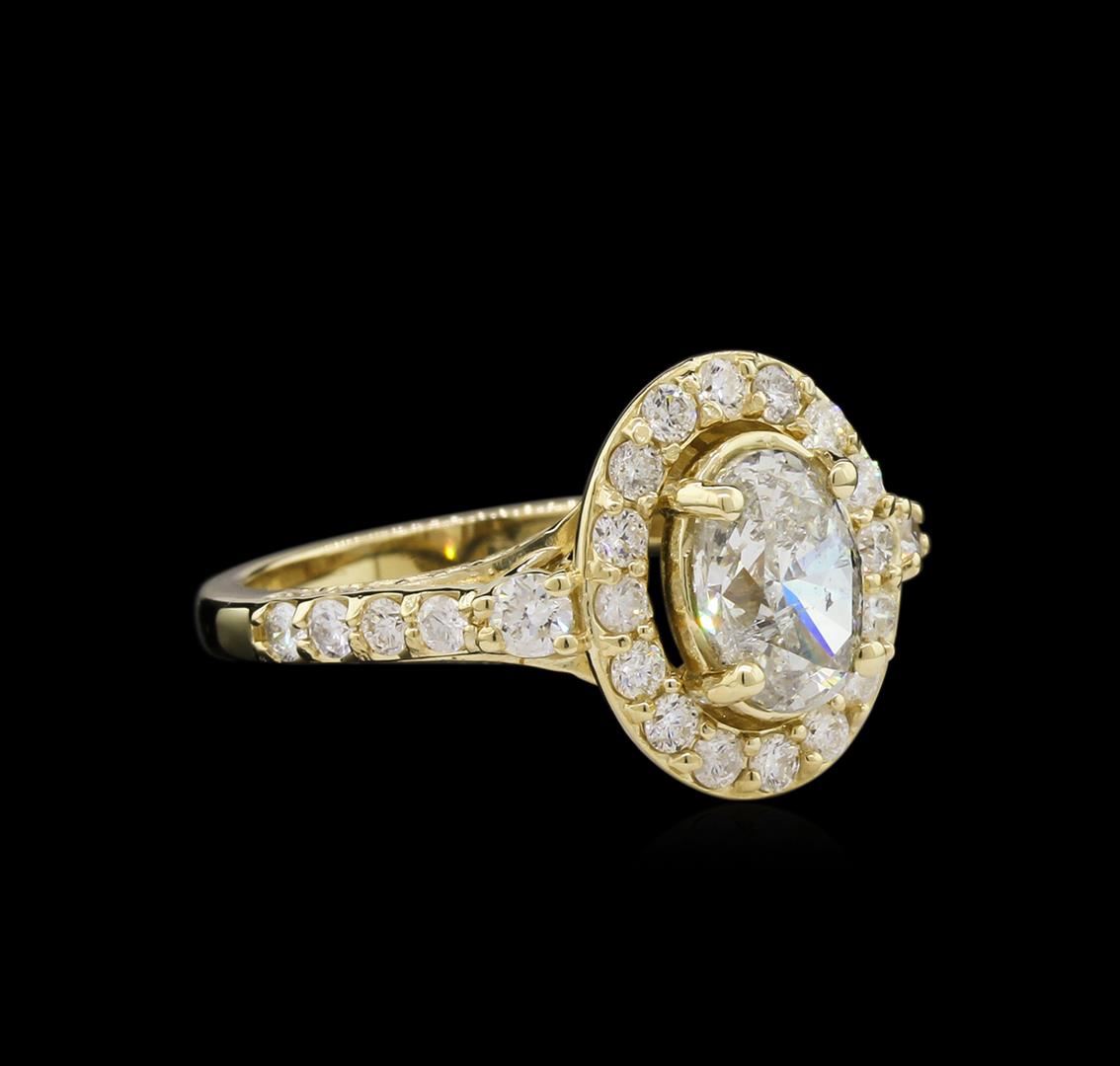 One electronically tested 14KT yellow gold lady's cast wedding ring with a halo with a bright polish finish. The featured lady's ring has a shank measuring 2.24 millimeters wide. Identified with markings of "K14". Condition is new, good workmanship. Containing: One prong set oval shaped cut diamond, measuring 8.18 x 5.98 x 4.01mm (depth est.) , 10.00.%. GTCF approximate weight of 1.47ct. Graded in the setting. Clarity: I-1. Color: I - Good Two prong set round brilliant cut diamonds, measuring 2.75 - 2.70 x 1.64mm (depth est.) approximate total weight of 2 Stones = 0.15ct. Graded in the setting. Clarity: SI-2 to I-1. Color: H - I. Cut Good Twenty-Four prong set round brilliant cut diamonds, measuring 1.90 - 1.85 x 1.17mm (depth est.) approximate total weight of 24 Stones = 0.60ct. Graded in the setting. Clarity: SI-1 to I-1. Color: H - I. Cut Good Forty-Eight prong set round brilliant cut diamonds, measuring 1.00 - 0.95 x 0.62mm (depth est.) approximate total weight of 48 Stones = 0.18ct. Graded in the setting. Clarity: SI-1 to I-1. Color: H - I. Cut Good. Total Weight of Diamonds 2.40ct. Total Weight of Ring 5.40gm. GAS Appraised at $10,730.00.
