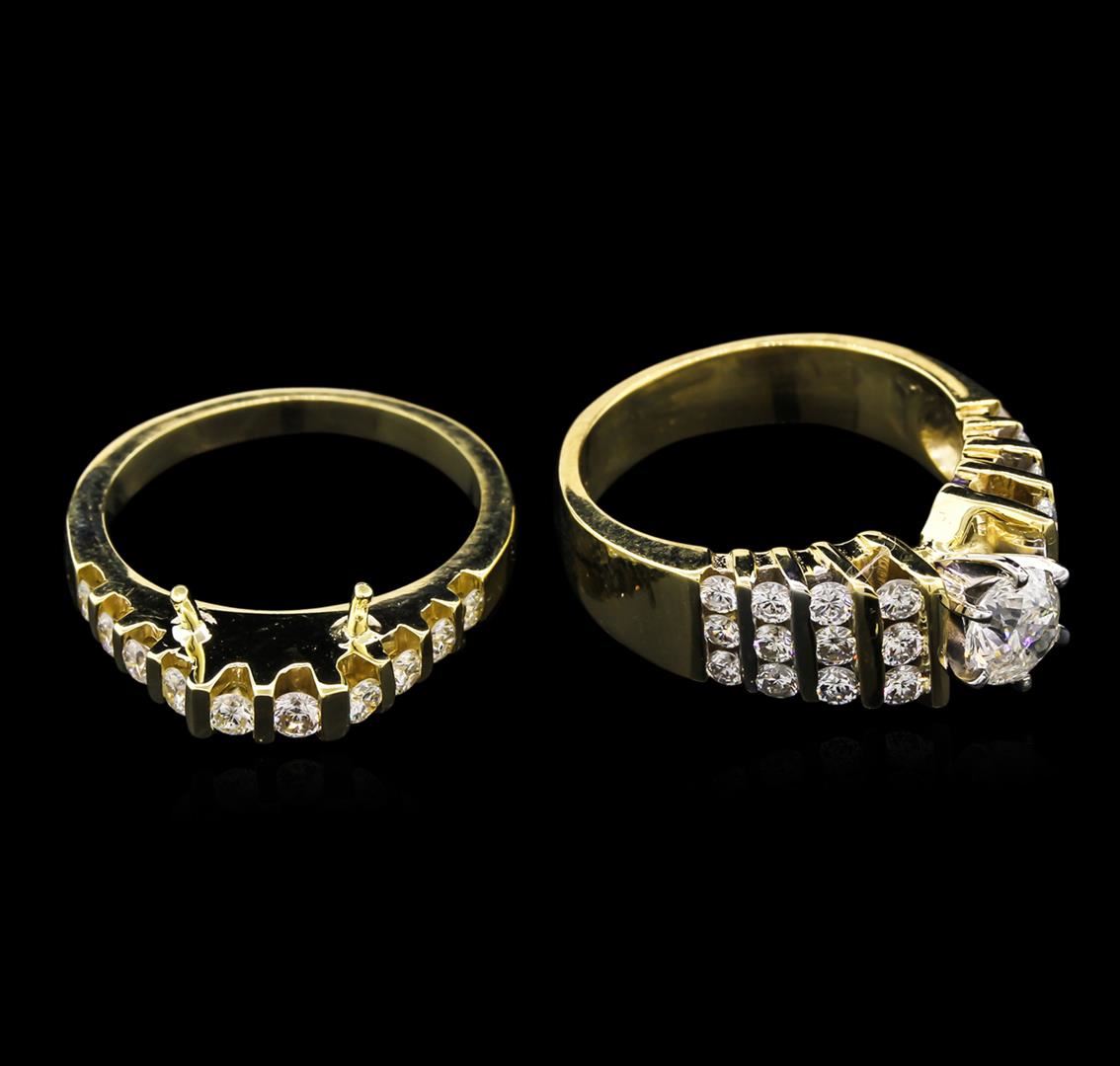 One electronically tested 14KT yellow gold lady's combination cast & assembled ring & wedding band with a bright polish finish. The featured lady's ring has a double shank measuring 7.00 millimeters wide. Identified with markings of "14K". Condition is new, good workmanship. Containing: One prong set round brilliant cut diamond, measuring 5.93 - 5.90 x 4.20mm (depth est.) approximate weight of 0.90ct. Graded in the setting. Clarity: I-1. Color: F. Cut Good Ten channel set round brilliant cut diamonds, measuring 2.40 - 2.20 x 1.50mm (depth est.) approximate total weight of 10 Stones = 0.50ct. Graded in the setting. Clarity: VS-2 to SI-2. Color: G - Good Twenty-Four channel set round brilliant cut diamonds, measuring 2.30 - 2.00 x 1.40mm (depth est.) approximate total weight of 24 Stones = 1.00ct. Graded in the setting. Clarity: VS-2 to SI-1. Color: H - I. Cut Good. Total Weight of Diamonds 2.40ct. Total Weight of Ring & Wedding Band 15.00gm. GAS Appraised at $9,135.00.