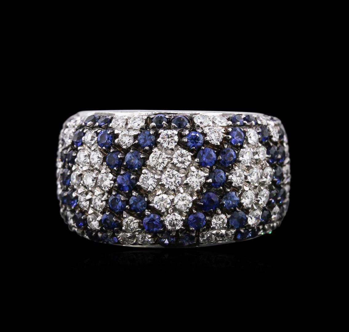 One electronically tested 18KT white gold ladies cast sapphire and diamond ring with a bright polish finish. Identified with markings of "750". Condition is new. Containing: Sixty prong set round modified brilliant cut natural blue sapphires, measuring 2.00 - 2.00 x 1.30 mm, approximate total weight of 2.40ct., clarity is moderately included, type II, medium, moderately strong, blue color, (GIA B 5/4), cut is good. Sixty-Nine prong set round brilliant cut diamonds, measuring 1.50 - 1.50 x 0.90mm (depth est.) approximate total weight of 69 Stones = 0.85ct. Clarity: SI-1 to SI-2. Color: G - H, Cut is Good. Colored gemstones are presumed to have been subjected to commonly used enhancement processes. All diamonds and colored gemstones are graded in the mounting, unless otherwise stated. Total Weight of Colored Stones 2.40ct. Total Weight of Diamonds 0.85ct. Total Weight of Ring 13.70 grams. GGL Appraised at $6,045.00.