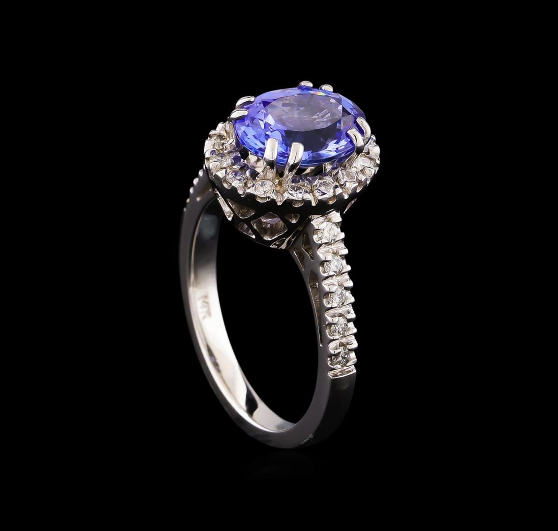 One electronically tested 14KT white gold lady's cast fashion ring with a basket halo with a bright polish finish. The featured lady's ring has a shank measuring 2.25 millimeters wide. Identified with markings of "14K". Condition is new, good workmanship. Containing: One prong set oval modified brilliant cut natural tanzanite, measuring 9.57 x 7.58 x 4.80mm, approximate weight of 2.41ct., clarity is eye clean, medium, very slightly grayish, bluish violet color, (GIA bV 5/3), cut is very good. Transmitting light with no distortion, transparent. Colored gemstones are presumed to have been subjected to commonly used enhancement processes. Graded in the setting. Twenty-Four prong set round brilliant cut diamonds, measuring 1.60 - 1.55 x 0.98mm (depth est.) approximate total weight of 24 Stones = 0.36ct. Graded in the setting. Clarity: VS-2 to SI-1. Color: G - Good. Total Weight of Colored Stones 2.41ct. Total Weight of Diamonds 0.36ct. Total Weight of Ring 5.50gm. GAS Appraised at $5,200.00.