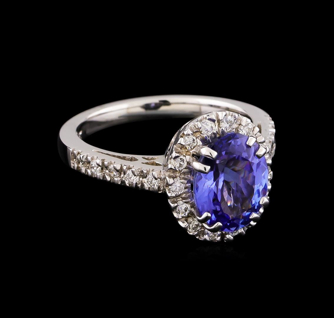 One electronically tested 14KT white gold lady's cast fashion ring with a basket halo with a bright polish finish. The featured lady's ring has a shank measuring 2.25 millimeters wide. Identified with markings of "14K". Condition is new, good workmanship. Containing: One prong set oval modified brilliant cut natural tanzanite, measuring 9.57 x 7.58 x 4.80mm, approximate weight of 2.41ct., clarity is eye clean, medium, very slightly grayish, bluish violet color, (GIA bV 5/3), cut is very good. Transmitting light with no distortion, transparent. Colored gemstones are presumed to have been subjected to commonly used enhancement processes. Graded in the setting. Twenty-Four prong set round brilliant cut diamonds, measuring 1.60 - 1.55 x 0.98mm (depth est.) approximate total weight of 24 Stones = 0.36ct. Graded in the setting. Clarity: VS-2 to SI-1. Color: G - Good. Total Weight of Colored Stones 2.41ct. Total Weight of Diamonds 0.36ct. Total Weight of Ring 5.50gm. GAS Appraised at $5,200.00.