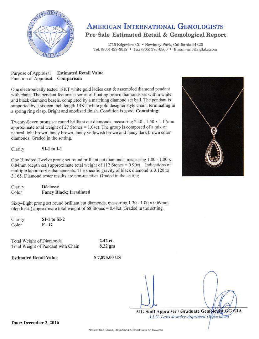 One electronically tested 18KT white gold ladies cast & assembled diamond pendant with chain. The pendant features a series of floating brown diamonds set within white and black diamond bezels, completed by a matching diamond set bail. The pendant is supported by a sixteen inch length 14KT white gold designer style chain, terminating in a spring ring clasp. Bright and anodized finish. Condition is good. Containing: Twenty-Seven prong set round brilliant cut diamonds, measuring 2.40 - 1.50 x 1.17mm approximate total weight of 27 Stones = 1.04ct. The group is composed of a mix of natural light brown, fancy brown, fancy yellowish brown and fancy dark brown color diamonds. Graded in the setting. Clarity: SI-1 to I-1. One Hundred Twelve prong set round brilliant cut diamonds, measuring 1.80 - 1.00 x 0.84mm (depth est.) approximate total weight of 112 Stones = 0.90ct. Indications of multiple laboratory enhancements. The specific gravity of black diamond is 3.120 to 3.165. Diamond tester results are non-reactive. Graded in the setting. Clarity Déclassé, Color Fancy Black; Irradiated. Sixty-Eight prong set round brilliant cut diamonds, measuring 1.30 - 1.00 x 0.69mm (depth est.) approximate total weight of 68 Stones = 0.48ct. Graded in the setting. Clarity SI-1 to SI-2. Color: F - G. Total Weight of Diamonds 2.42ct.. Total Weight of Pendant With Chain 8.22gm. AIG Appraised at $5,950.00.