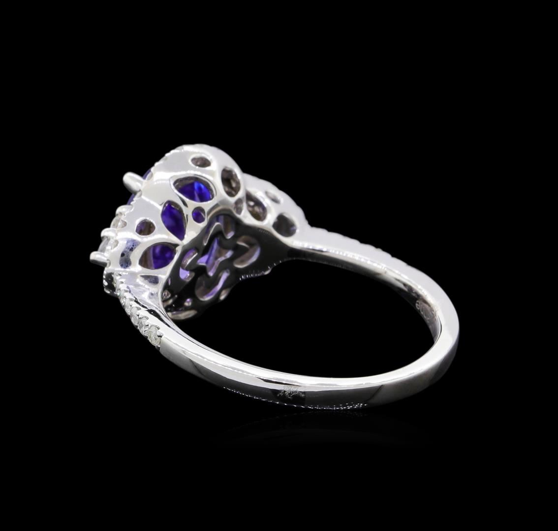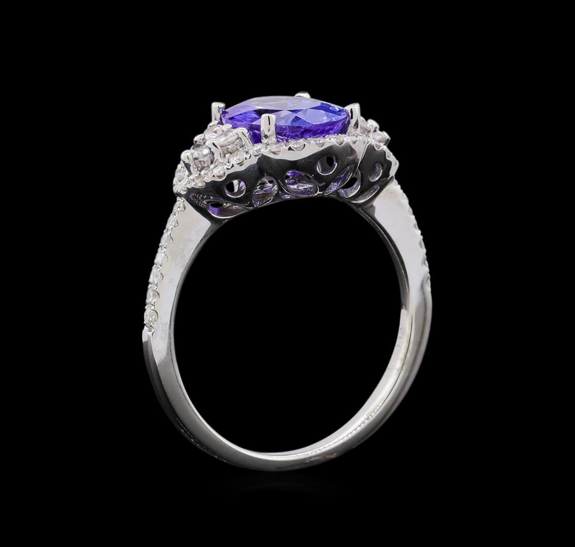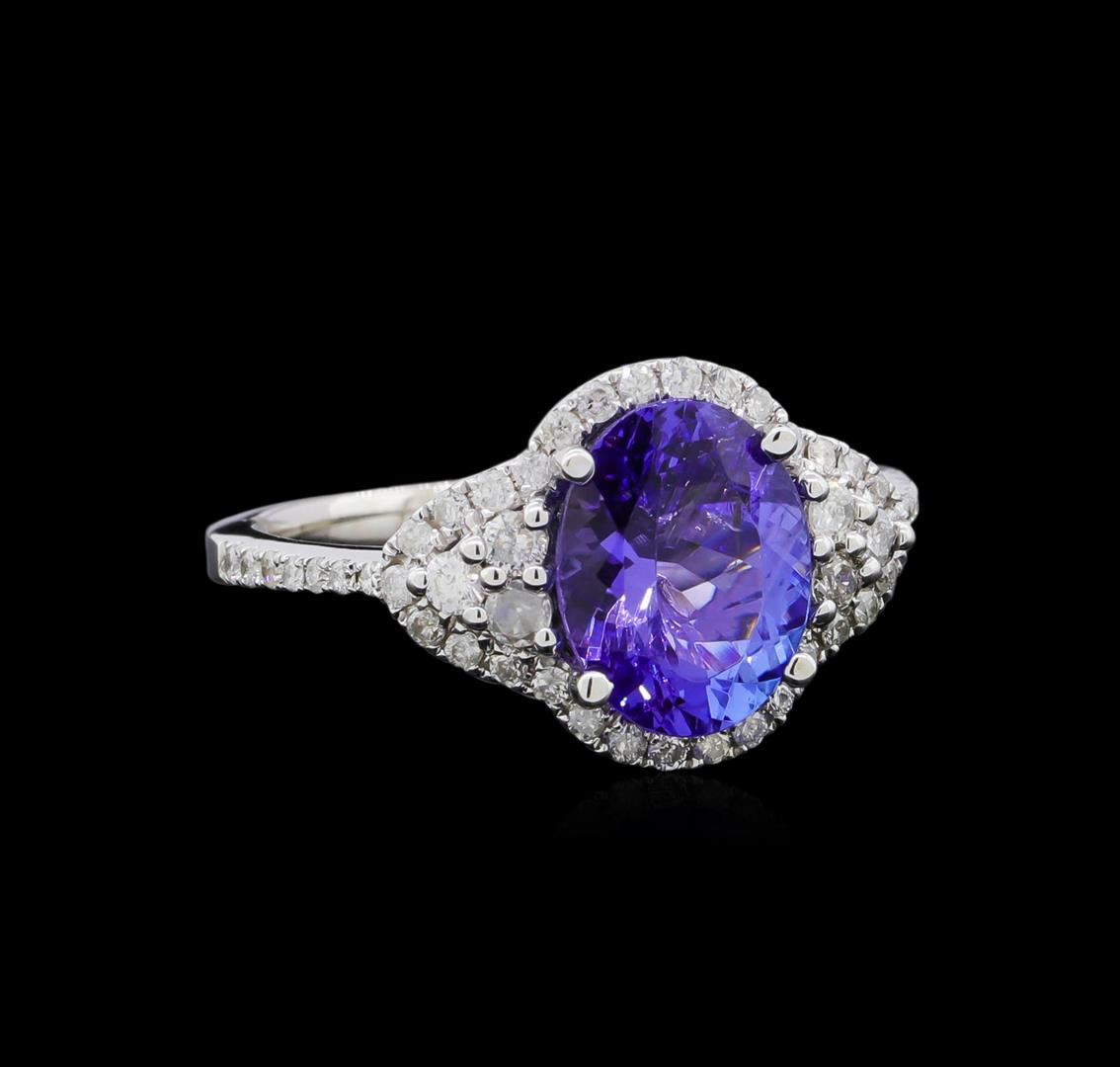 One electronically tested 14KT white gold ladies cast tanzanite and diamond ring with a bright polish finish. The featured tanzanite is set within a stylized diamond bezel supported by diamond set shoulders, completed by a one and one-half millimeter wide band. Trademark is Orianne. Identified with markings of "14K". Condition is new, good workmanship. Containing: One prong set oval mixed cut natural tanzanite approximate weight of 2.42ct., clarity is slightly included, type I, medium, very slightly grayish, bluish violet color, (GIA bV 5/3), cut is good. Transmitting light with a minimum of distortion, transparent. Naturally occurring internal & external characteristics are present. Graded in the setting. Tanzanite is a very rare gemstone that is only found in the country of Tanzania. Originally discovered in 1967. Tiffany & Company, named the stone Tanzanite. It is found in the Usumburu Mountains that border the Umba Valley of northern Tanzania. Tanzanite occurs in gray, brown, violet, blue, reddish-purple, & green. The gem is interesting because of its exceptional pleochroism. Rotated in different directions a tanzanite will exhibit multiple changes of color. Tanzanite has a low tolerance to ultrasonic cleaning, and should not be cleaned using this method. Fifty prong set round brilliant cut diamonds approximate total weight of 50 Stones = 0.45ct. Graded in the setting. Clarity: I-1 to I-3. Color: H - J. Total Weight of Colored Stones 2.42ct. Total Weight of Diamonds 0.45ct. Total Weight of Ring 3.93gm AIG Appraised at $5,770.00.