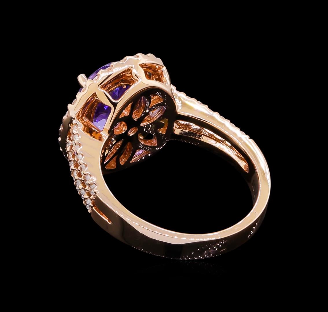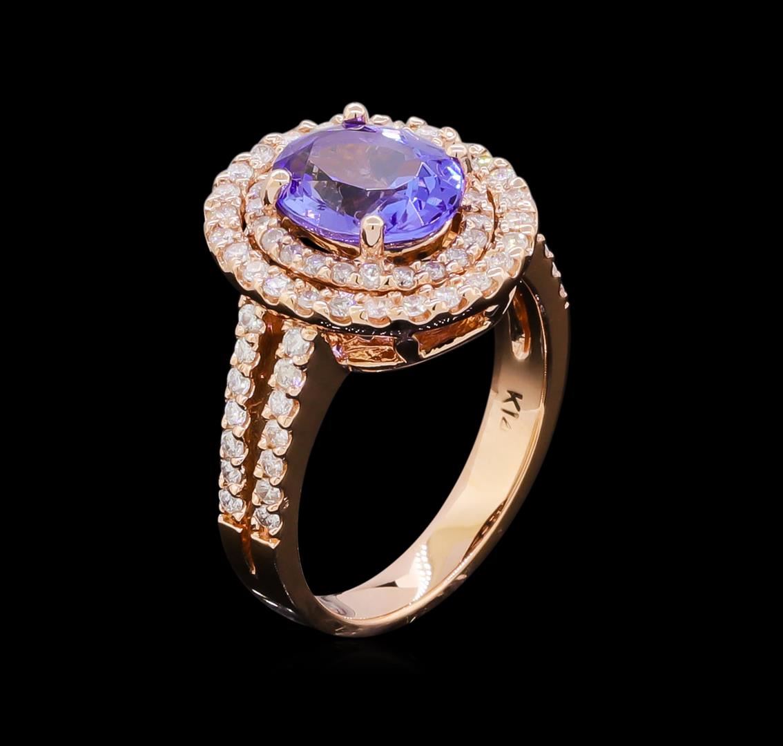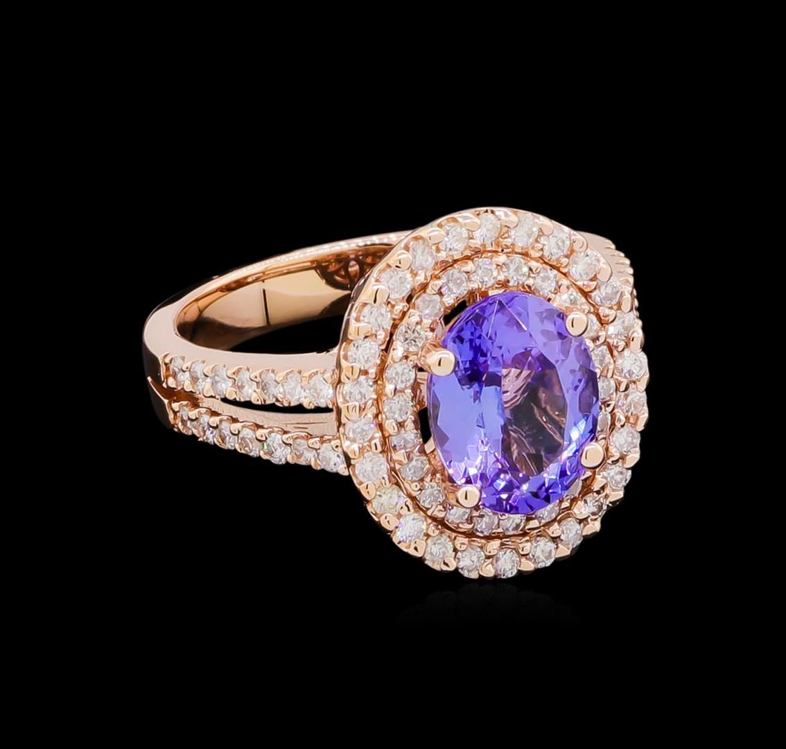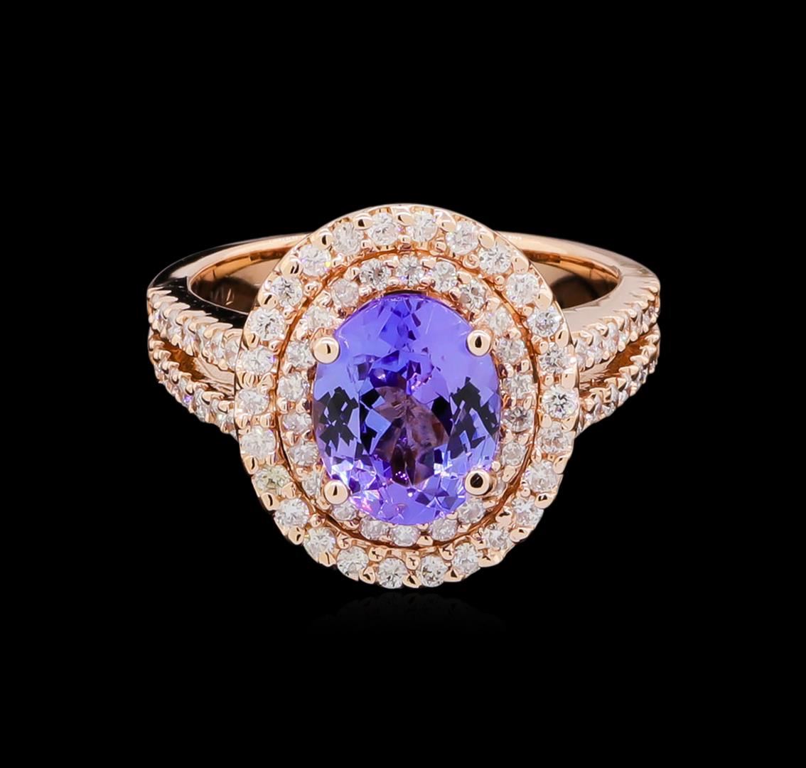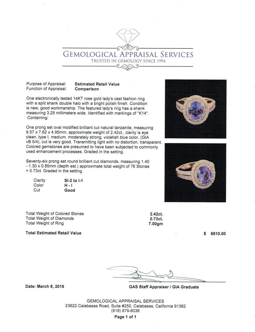 One electronically tested 14KT rose gold lady's cast fashion ring with a split shank double halo with a bright polish finish. The featured lady's ring has a shank measuring 3.25 millimeters wide. Identified with markings of "K14". Condition is new, good workmanship. Containing: One prong set oval modified brilliant cut natural tanzanite, measuring 9.57 x 7.62 x 4.95mm, approximate weight of 2.42ct., clarity is eye clean, type I, medium, moderately strong, violetish blue color, (GIA vB 5/4), cut is very good. Transmitting light with no distortion, transparent. Colored gemstones are presumed to have been subjected to commonly used enhancement processes. Graded in the setting. Seventy-Six prong set round brilliant cut diamonds, measuring 1.40 - 1.30 x 0.85mm (depth est.) approximate total weight of 76 Stones = 0.73ct. Graded in the setting. Clarity: SI-2 to I-1. Color: H - I. Cut Good. Total Weight of Colored Stones 2.42ct. Total Weight of Diamonds 0.73ct. Total Weight of Ring 7.00gm. GAS Appraised at $6,610.00.
