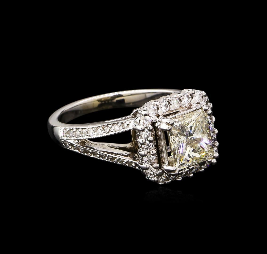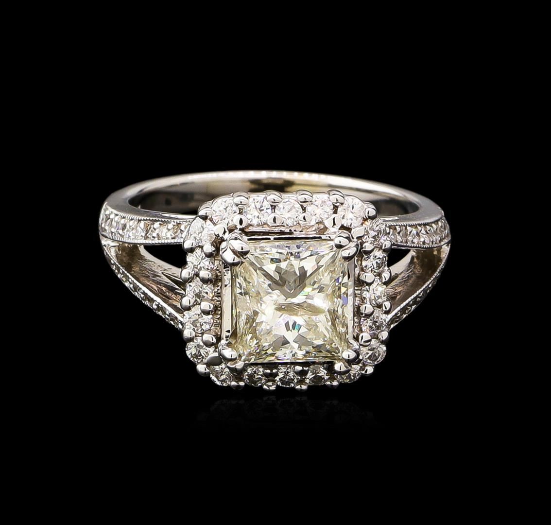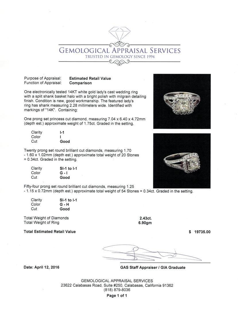 One electronically tested 14KT white gold lady's cast wedding ring with a split shank basket halo with a bright polish with milgrain detailing finish. The featured lady's ring has shank measuring 2.28 millimeters wide. Identified with markings of "14K". Condition is new, good workmanship. Containing: One prong set princess cut diamond, measuring 7.04 x 6.40 x 4.72mm (depth est.) approximate weight of 1.75ct. Graded in the setting. Clarity: I-1. Color: I. Cut Good Twenty prong set round brilliant cut diamonds, measuring 1.70 - 1.60 x 1.02mm (depth est.) approximate total weight of 20 Stones = 0.34ct. Graded in the setting. Clarity: SI-1 to I-1. Color: G - I. Cut Good Fifty-Four prong set round brilliant cut diamonds, measuring 1.25 - 1.15 x 0.72mm (depth est.) approximate total weight of 54 Stones = 0.34ct. Graded in the setting. Clarity: SI-1 to I-1. Color: G - Good. Total Weight of Diamonds 2.43ct. Total Weight of Ring 6.90gm. GAS Appraised at $19,735.00.
