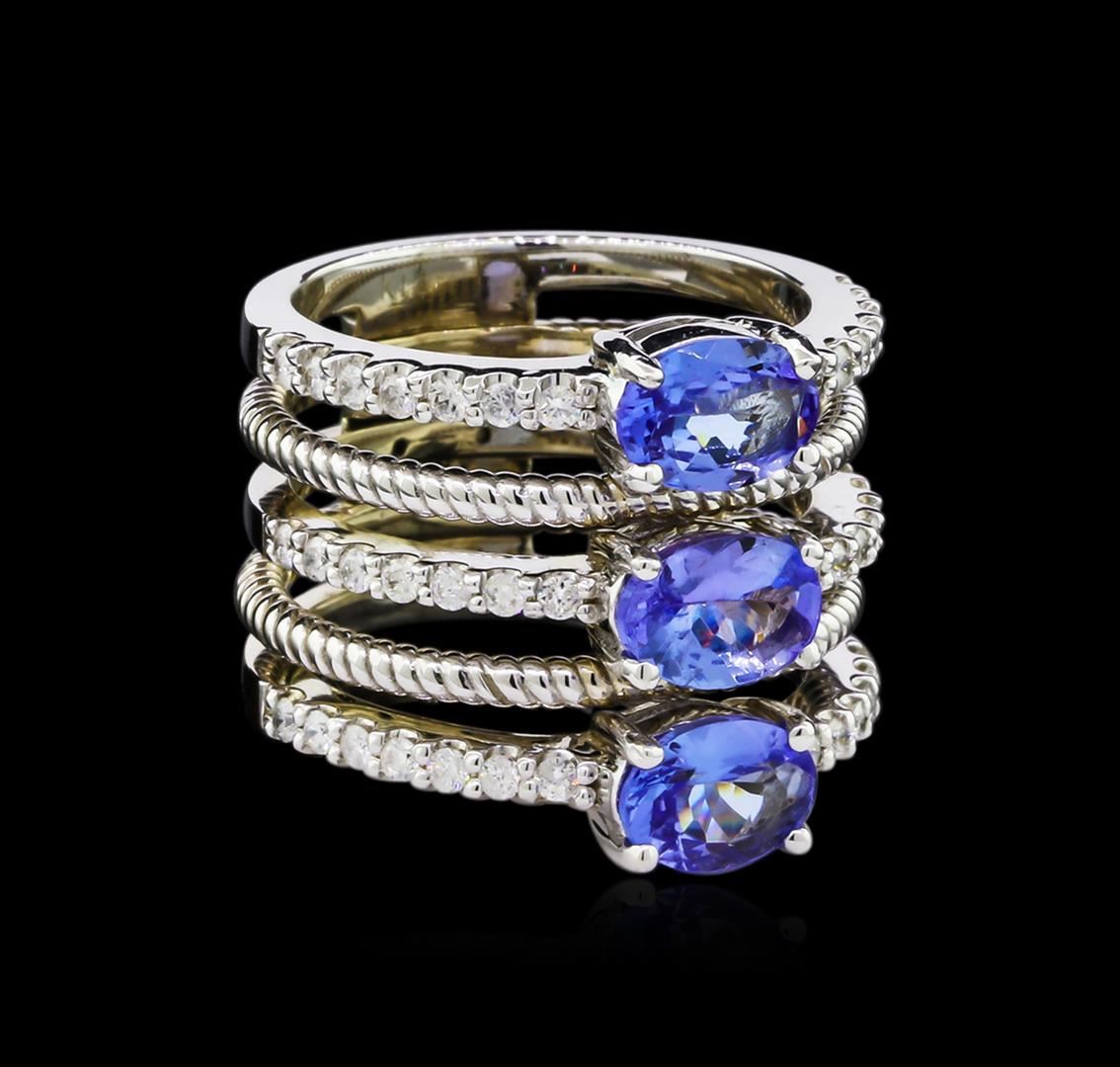 One electronically tested 14KT white gold lady's combination cast & assembled fashion ring with a five row split shank with a bright polish finish. The featured lady's ring has a shank measuring 13.28 millimeters wide. Identified with markings of "K14". Condition is new, good workmanship. Containing: Three prong set oval modified brilliant cut natural tanzanite's, measuring 7.15 x 5.21 x 3.04mm, approximate total weight of 2.43ct., clarity is slightly included, type I, medium light, very slightly grayish, bluish violet color, (GIA bV 4/3), cut is good. Transmitting light with a minimum of distortion, transparent. Colored gemstones are presumed to have been subjected to commonly used enhancement processes. Graded in the setting. Forty-Two prong set round brilliant cut diamonds, measuring 1.50 - 1.45 x 0.93mm (depth est.) approximate total weight of 42 Stones = 0.55ct. Graded in the setting. Clarity: SI-1 to I-1. Color: H - I. Cut Good. Total Weight of Colored Stones 2.43ct. Total Weight of Diamonds 0.55ct. Total Weight of Ring 11.40gm. GAS Appraised at $4,190.00.