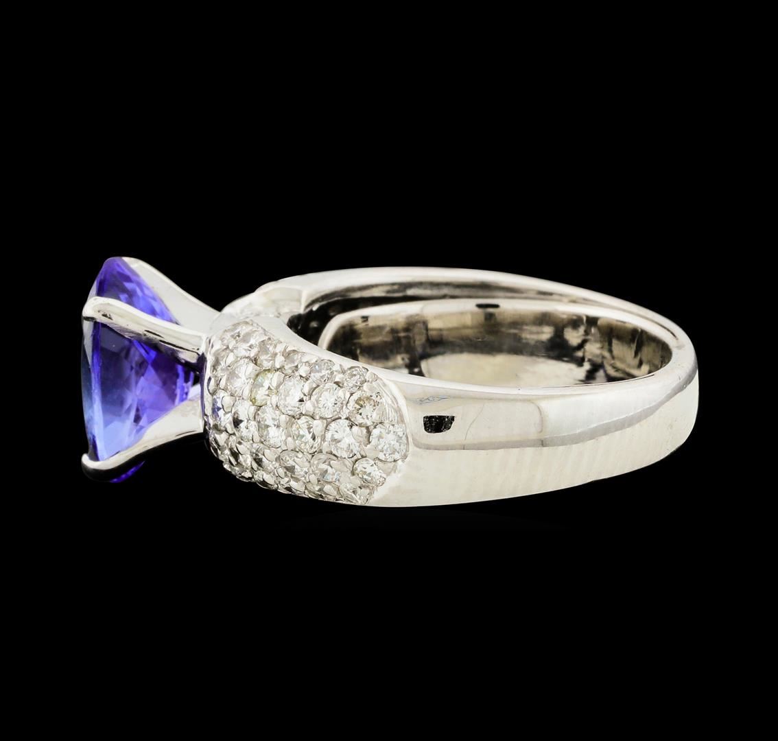 One electronically tested 14KT white gold lady's combination cast & assembled fashion ring with a tapered cathedral shank with a bright polish finish. The featured lady's ring has an internal spring shank for sizing and a shank measuring 3.78 millimeters wide. Condition is like new, good workmanship. Containing: One prong set oval modified brilliant cut natural tanzanite, measuring 10.00 x 7.80 x 4.68mm, (depth est.) approximate weight of 2.43ct., clarity is eye clean, medium, moderately strong, violet color, (GIA V 5/4), cut is good. Transmitting light with no distortion, transparent. Colored gemstones are presumed to have been subjected to commonly used enhancement processes. Graded in the setting. Thirty-Two prong set round brilliant cut diamonds, measuring 2.00 - 1.90 x 1.21mm (depth est.) approximate total weight of 32 Stones = 0.90ct. Graded in the setting. Clarity VS-2 to SI-2. Color: H - I Cut Good Thirty-Two prong set round brilliant cut diamonds, measuring 1.80 - 1.60 x 1.05mm (depth est.) approximate total weight of 32 Stones = 0.60ct. Graded in the setting. Clarity VS-2 to SI-1. Color: H - I Cut Good. Total Weight of Colored Stones 2.43ct.. Total Weight of Diamonds 1.50ct.. Total Weight of Ring 7.60gm. GAS Appraised at $6,625.00.