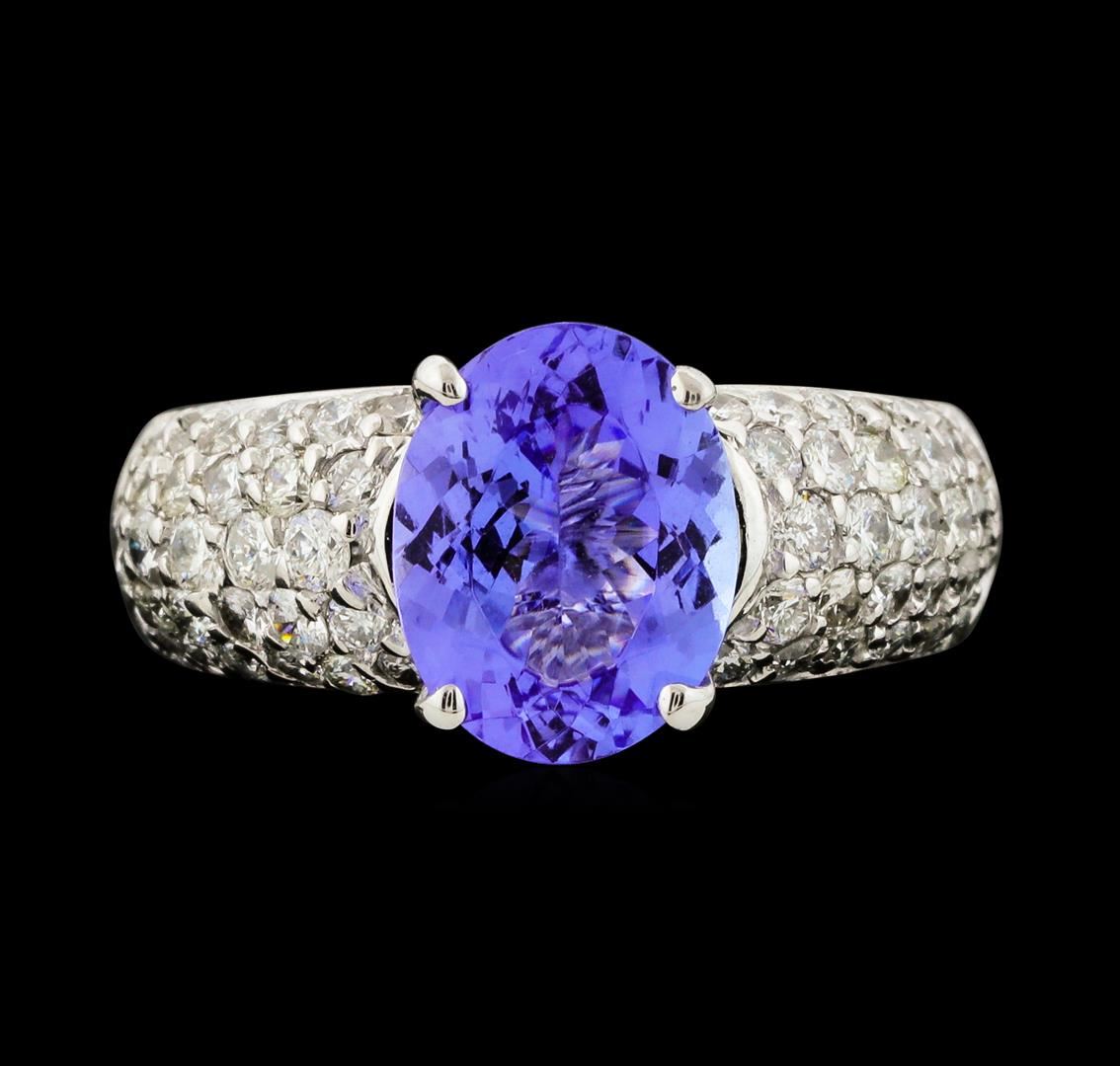 One electronically tested 14KT white gold lady's combination cast & assembled fashion ring with a tapered cathedral shank with a bright polish finish. The featured lady's ring has an internal spring shank for sizing and a shank measuring 3.78 millimeters wide. Condition is like new, good workmanship. Containing: One prong set oval modified brilliant cut natural tanzanite, measuring 10.00 x 7.80 x 4.68mm, (depth est.) approximate weight of 2.43ct., clarity is eye clean, medium, moderately strong, violet color, (GIA V 5/4), cut is good. Transmitting light with no distortion, transparent. Colored gemstones are presumed to have been subjected to commonly used enhancement processes. Graded in the setting. Thirty-Two prong set round brilliant cut diamonds, measuring 2.00 - 1.90 x 1.21mm (depth est.) approximate total weight of 32 Stones = 0.90ct. Graded in the setting. Clarity VS-2 to SI-2. Color: H - I Cut Good Thirty-Two prong set round brilliant cut diamonds, measuring 1.80 - 1.60 x 1.05mm (depth est.) approximate total weight of 32 Stones = 0.60ct. Graded in the setting. Clarity VS-2 to SI-1. Color: H - I Cut Good. Total Weight of Colored Stones 2.43ct.. Total Weight of Diamonds 1.50ct.. Total Weight of Ring 7.60gm. GAS Appraised at $6,625.00.