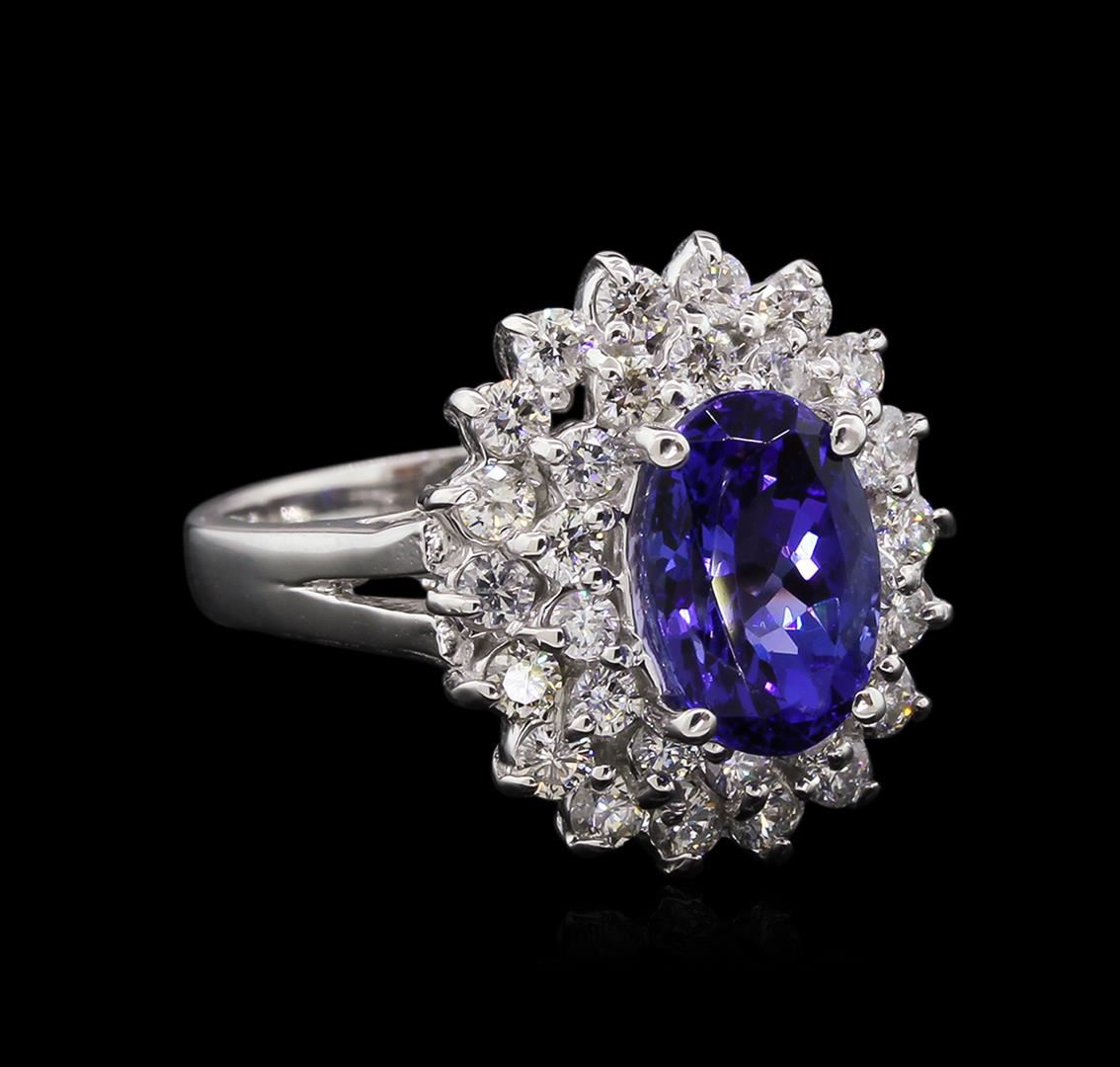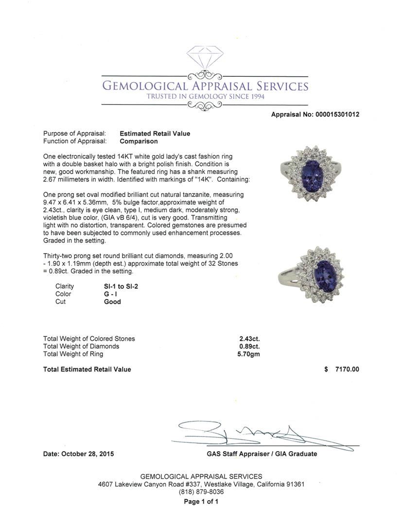 One electronically tested 14KT white gold lady's cast fashion ring with a double basket halo with a bright polish finish. The featured ring has a shank measuring 2.67 millimeters in width. Identified with markings of "14K". Condition is new, good workmanship. Containing: One prong set oval modified brilliant cut natural tanzanite, measuring 9.47 x 6.41 x 5.36mm, 5% bulge factor, approximate weight of 2.43ct., clarity is eye clean, type I, medium dark, moderately strong, violetish blue color, (GIA vB 6/4), cut is very good. Transmitting light with no distortion, transparent. Colored gemstones are presumed to have been subjected to commonly used enhancement processes. Graded in the setting. Thirty-Two prong set round brilliant cut diamonds, measuring 2.00 - 1.90 x 1.19mm (depth est.) approximate total weight of 32 Stones = 0.89ct. Graded in the setting. Clarity: SI-1 to SI-2. Color: G - I. Cut Good. Total Weight of Colored Stones 2.43ct. Total Weight of Diamonds 0.89ct. Total Weight of Ring 5.70gm. GAS Appraised at $7,170.00.