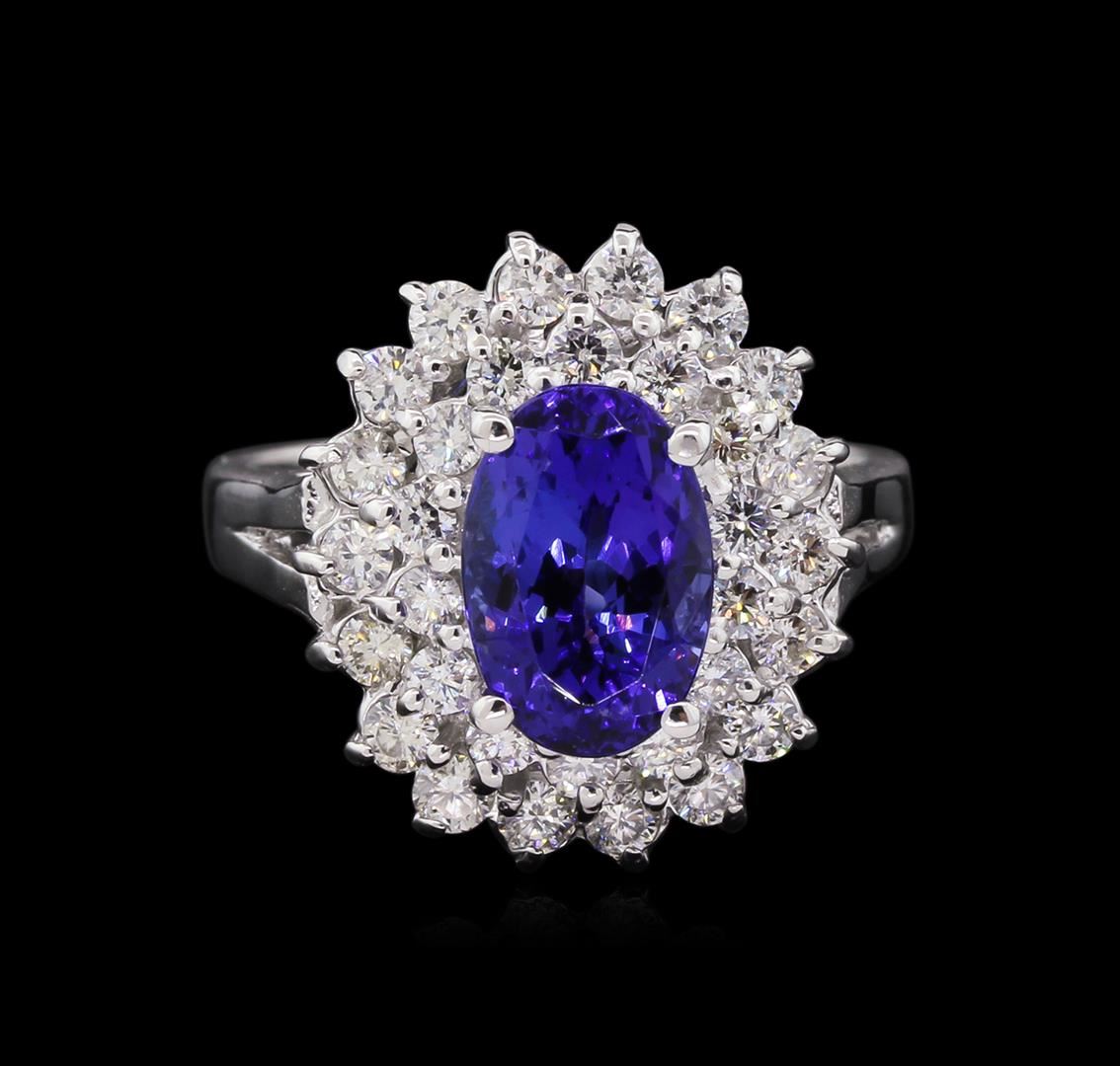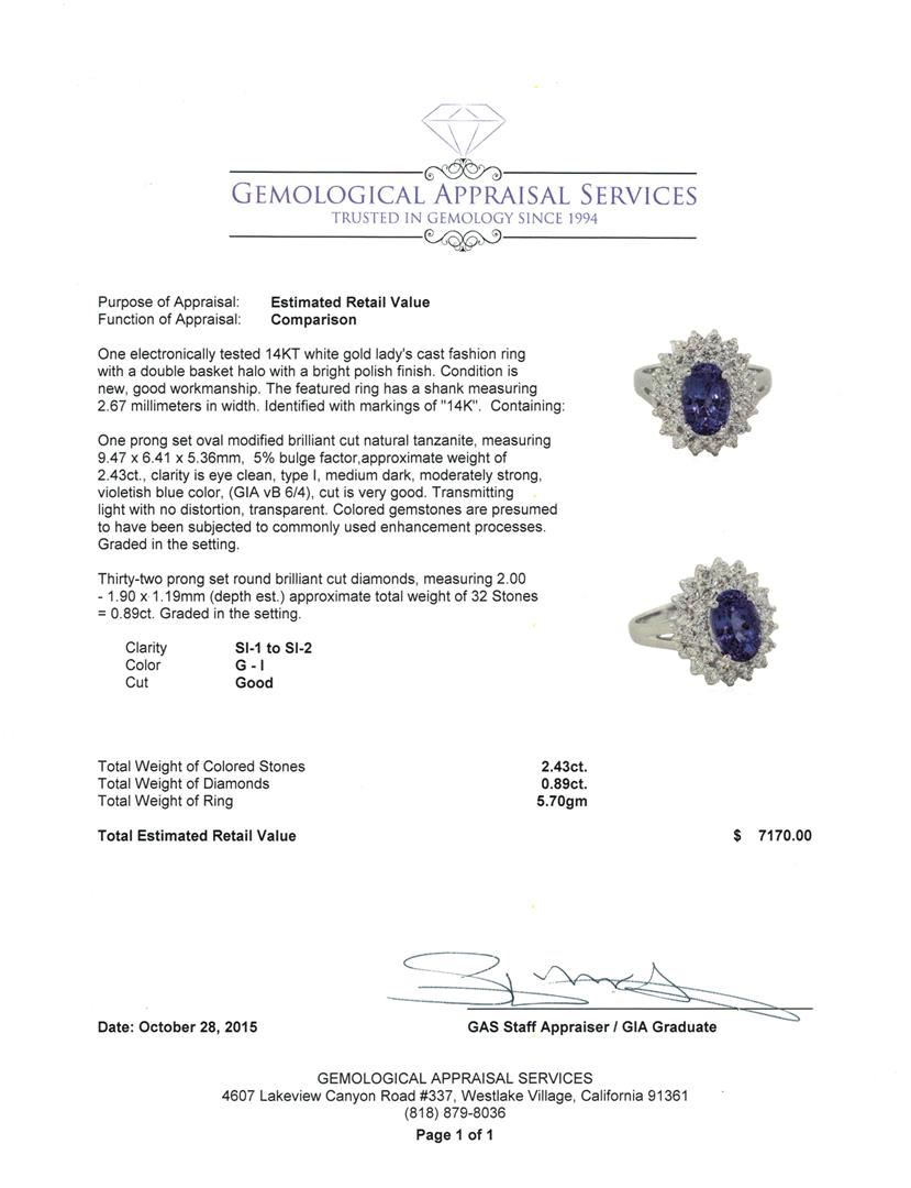 One electronically tested 14KT white gold lady's cast fashion ring with a double basket halo with a bright polish finish. The featured ring has a shank measuring 2.67 millimeters in width. Identified with markings of "14K". Condition is new, good workmanship. Containing: One prong set oval modified brilliant cut natural tanzanite, measuring 9.47 x 6.41 x 5.36mm, 5% bulge factor, approximate weight of 2.43ct., clarity is eye clean, type I, medium dark, moderately strong, violetish blue color, (GIA vB 6/4), cut is very good. Transmitting light with no distortion, transparent. Colored gemstones are presumed to have been subjected to commonly used enhancement processes. Graded in the setting. Thirty-Two prong set round brilliant cut diamonds, measuring 2.00 - 1.90 x 1.19mm (depth est.) approximate total weight of 32 Stones = 0.89ct. Graded in the setting. Clarity: SI-1 to SI-2. Color: G - I. Cut Good. Total Weight of Colored Stones 2.43ct. Total Weight of Diamonds 0.89ct. Total Weight of Ring 5.70gm. GAS Appraised at $7,170.00.