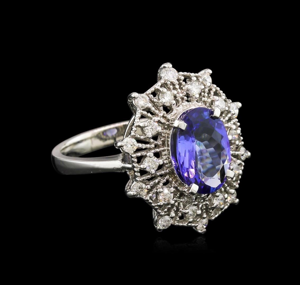 One electronically tested 14KT white gold lady's cast fashion ring with a basket setting with a bright polish with milgrain detailing finish. The featured lady's ring has a shank measuring 2.82 millimeters wide. Identified with markings of "K14". Condition is new, good workmanship. Containing: One prong set oval modified brilliant cut natural tanzanite, measuring 11.00 x 8.01 x 3.87mm, approximate weight of 2.43ct., clarity is eye clean, type I, medium, very slightly grayish, violetish blue color, (GIA vB 5/3), cut is good. Transmitting light with no distortion, transparent. Colored gemstones are presumed to have been subjected to commonly used enhancement processes. Graded in the setting. Twenty prong set round brilliant cut diamonds, measuring 1.90 - 1.85 x 1.17mm (depth est.) approximate total weight of 20 Stones = 0.50ct. Graded in the setting. Clarity: SI-2 to I-1. Color: H - I. Cut Good. Total Weight of Colored Stones 2.43ct. Total Weight of Diamonds 0.50ct. Total Weight of Ring 5.90gm. GAS Appraised at $5,780.00.