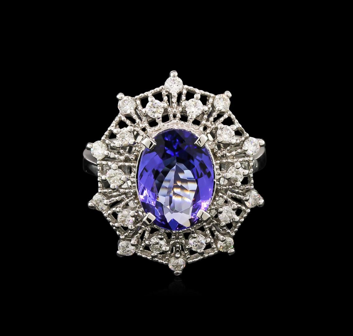 One electronically tested 14KT white gold lady's cast fashion ring with a basket setting with a bright polish with milgrain detailing finish. The featured lady's ring has a shank measuring 2.82 millimeters wide. Identified with markings of "K14". Condition is new, good workmanship. Containing: One prong set oval modified brilliant cut natural tanzanite, measuring 11.00 x 8.01 x 3.87mm, approximate weight of 2.43ct., clarity is eye clean, type I, medium, very slightly grayish, violetish blue color, (GIA vB 5/3), cut is good. Transmitting light with no distortion, transparent. Colored gemstones are presumed to have been subjected to commonly used enhancement processes. Graded in the setting. Twenty prong set round brilliant cut diamonds, measuring 1.90 - 1.85 x 1.17mm (depth est.) approximate total weight of 20 Stones = 0.50ct. Graded in the setting. Clarity: SI-2 to I-1. Color: H - I. Cut Good. Total Weight of Colored Stones 2.43ct. Total Weight of Diamonds 0.50ct. Total Weight of Ring 5.90gm. GAS Appraised at $5,780.00.