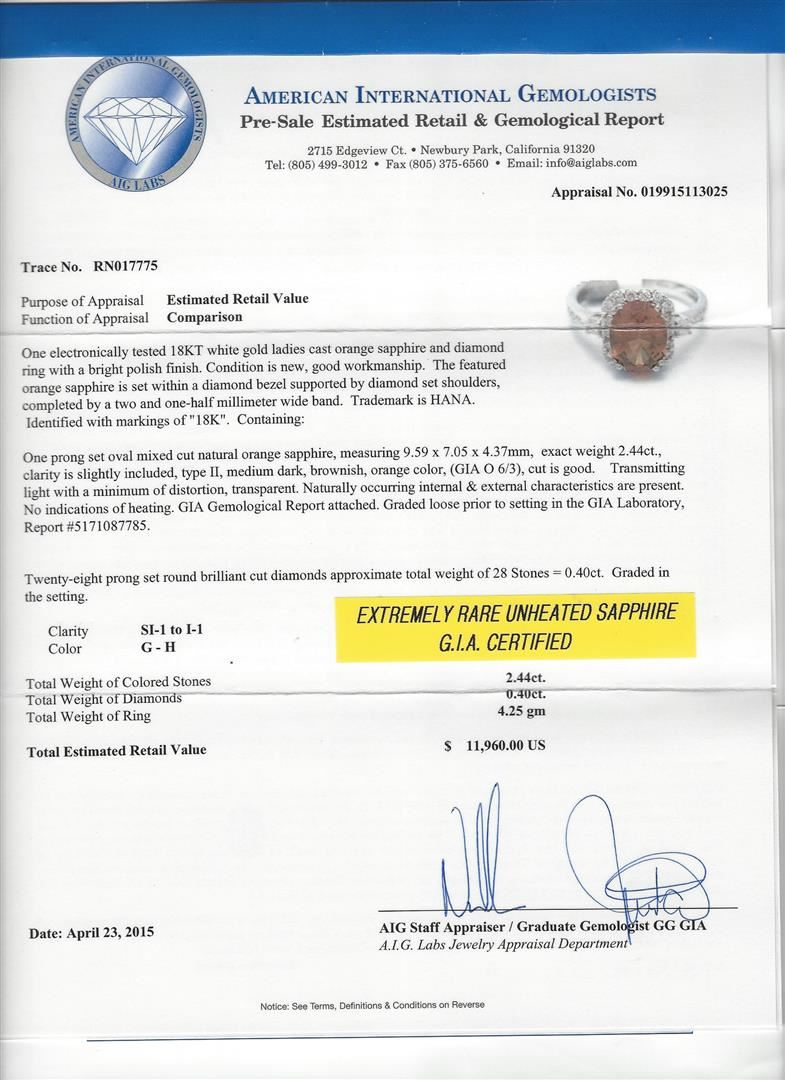 One 2.44ct Sapphire and Diamond Ring - 18KT White Gold. AIG certified. See Appraisal for more details. AIG Appraised.