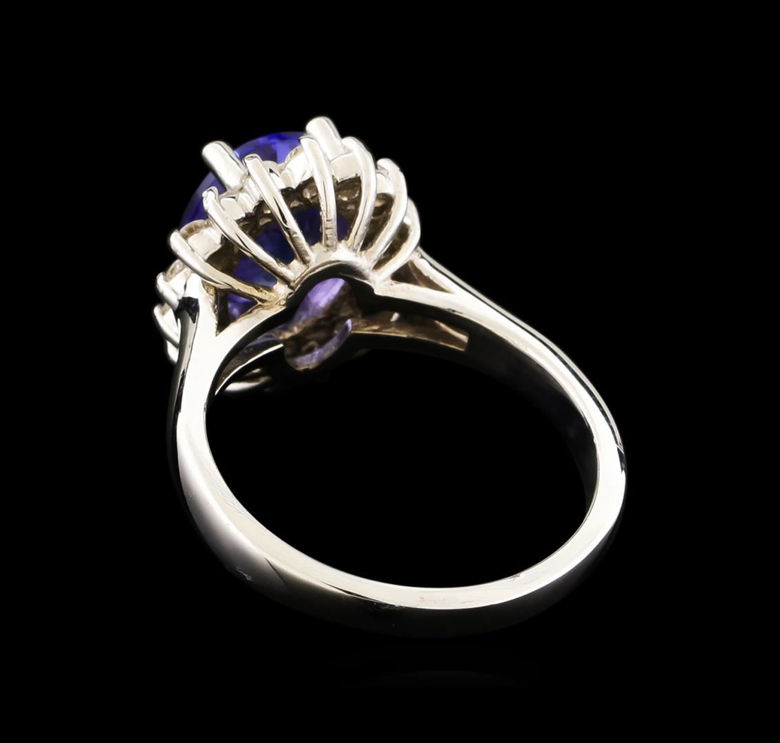 One electronically tested 14KT white gold lady's cast fashion ring with a basket halo with a bright polish finish. The featured lady's ring has a shank measuring 2.33 millimeters wide. Identified with markings of "14K". Condition is new, good workmanship. Containing: One prong set oval modified brilliant cut natural tanzanite, measuring 9.73 x 7.47 x 4.61mm, approximate weight of 2.44ct., clarity is eye clean, medium, moderately strong, violetish blue color, (GIA vB 5/4), cut is very good. Transmitting light with no distortion, transparent. Colored gemstones are presumed to have been subjected to commonly used enhancement processes. Graded in the setting. Sixteen prong set round brilliant cut diamonds, measuring 1.90 - 1.80 x 1.15mm (depth est.) approximate total weight of 16 Stones = 0.39ct. Graded in the setting. Clarity: SI-1 to SI-2. Color: H - I. Cut Good. Total Weight of Colored Stones 2.44ct. Total Weight of Diamonds 0.39ct. Total Weight of Ring 5.30gm. GAS Appraised at $5,225.00.