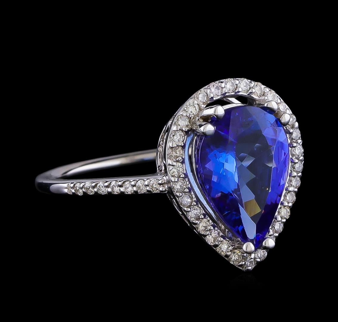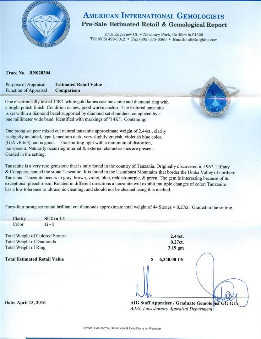 One electronically tested 14KT white gold ladies cast tanzanite and diamond ring with a bright polish finish. The featured tanzanite is set within a diamond bezel supported by diamond set shoulders, completed by a one millimeter wide band. Identified with markings of "14K". Condition is new, good workmanship. Containing: One prong set pear mixed cut natural tanzanite approximate weight of 2.44ct., clarity is slightly included, type I, medium dark, very slightly grayish, violetish blue color, (GIA vB 6/3), cut is good. Transmitting light with a minimum of distortion, transparent. Naturally occurring internal & external characteristics are present. Graded in the setting. Tanzanite is a very rare gemstone that is only found in the country of Tanzania. Originally discovered in 1967. Tiffany & Company, named the stone Tanzanite. It is found in the Usumburu Mountains that border the Umba Valley of northern Tanzania. Tanzanite occurs in gray, brown, violet, blue, reddish-purple, & green. The gem is interesting because of its exceptional pleochroism. Rotated in different directions a tanzanite will exhibit multiple changes of color. Tanzanite has a low tolerance to ultrasonic cleaning, and should not be cleaned using this method. Forty-Four prong set round brilliant cut diamonds approximate total weight of 44 Stones = 0.27ct. Graded in the setting. Clarity: SI-2 to I-1. Color: G - I. Total Weight of Colored Stones 2.44ct. Total Weight of Diamonds 0.27ct. Total Weight of Ring 3.19gm. AIG Appraised at $6,340.00.
