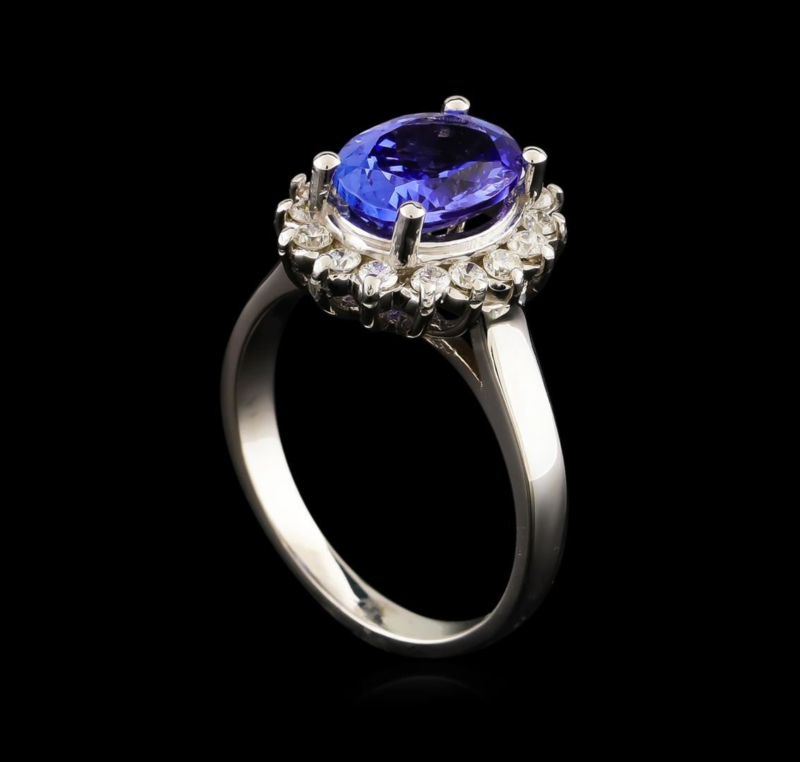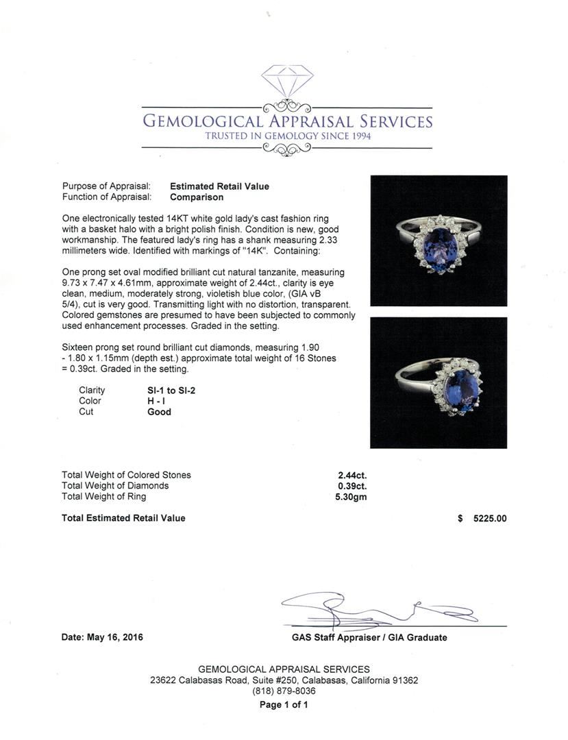 One electronically tested 14KT white gold lady's cast fashion ring with a basket halo with a bright polish finish. The featured lady's ring has a shank measuring 2.33 millimeters wide. Identified with markings of "14K". Condition is new, good workmanship. Containing: One prong set oval modified brilliant cut natural tanzanite, measuring 9.73 x 7.47 x 4.61mm, approximate weight of 2.44ct., clarity is eye clean, medium, moderately strong, violetish blue color, (GIA vB 5/4), cut is very good. Transmitting light with no distortion, transparent. Colored gemstones are presumed to have been subjected to commonly used enhancement processes. Graded in the setting. Sixteen prong set round brilliant cut diamonds, measuring 1.90 - 1.80 x 1.15mm (depth est.) approximate total weight of 16 Stones = 0.39ct. Graded in the setting. Clarity: SI-1 to SI-2. Color: H - I. Cut Good. Total Weight of Colored Stones 2.44ct. Total Weight of Diamonds 0.39ct. Total Weight of Ring 5.30gm. GAS Appraised at $5,225.00.