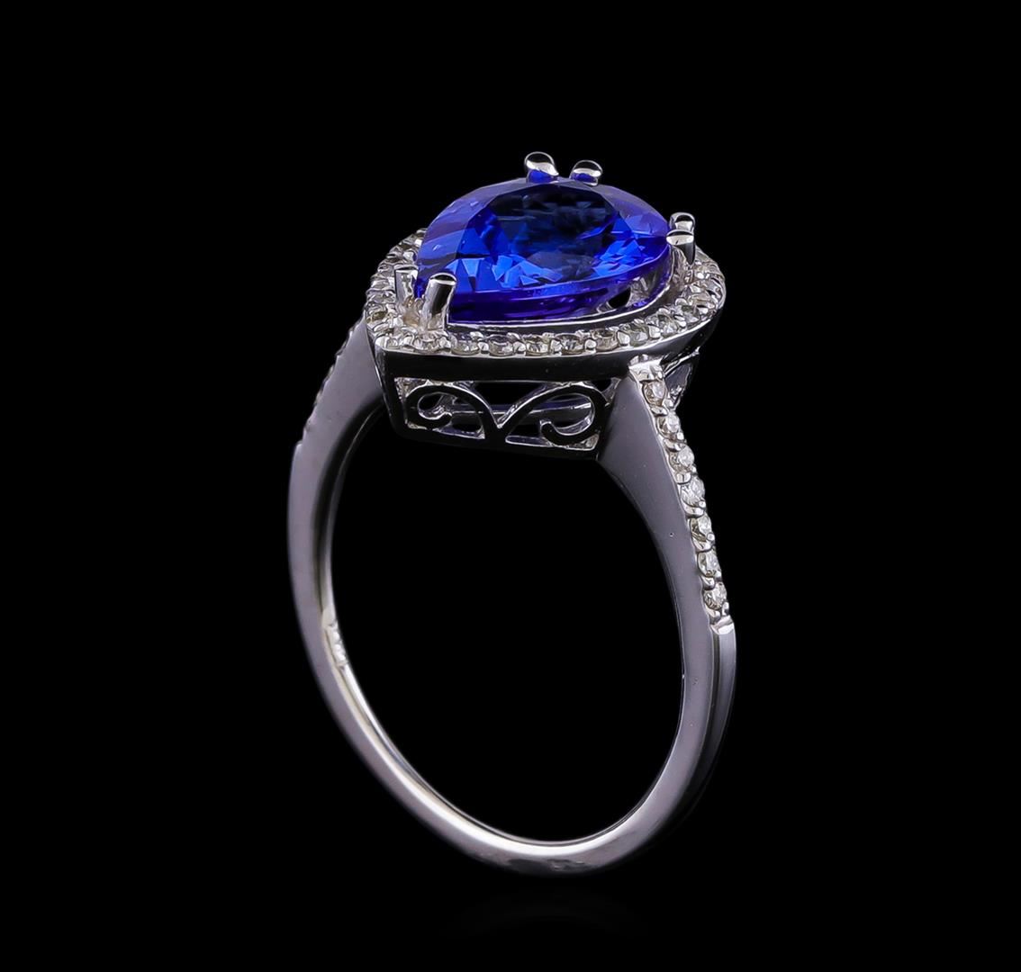 One electronically tested 14KT white gold ladies cast tanzanite and diamond ring with a bright polish finish. The featured tanzanite is set within a diamond bezel supported by diamond set shoulders, completed by a one millimeter wide band. Identified with markings of "14K". Condition is new, good workmanship. Containing: One prong set pear mixed cut natural tanzanite approximate weight of 2.44ct., clarity is slightly included, type I, medium dark, very slightly grayish, violetish blue color, (GIA vB 6/3), cut is good. Transmitting light with a minimum of distortion, transparent. Naturally occurring internal & external characteristics are present. Graded in the setting. Tanzanite is a very rare gemstone that is only found in the country of Tanzania. Originally discovered in 1967. Tiffany & Company, named the stone Tanzanite. It is found in the Usumburu Mountains that border the Umba Valley of northern Tanzania. Tanzanite occurs in gray, brown, violet, blue, reddish-purple, & green. The gem is interesting because of its exceptional pleochroism. Rotated in different directions a tanzanite will exhibit multiple changes of color. Tanzanite has a low tolerance to ultrasonic cleaning, and should not be cleaned using this method. Forty-Four prong set round brilliant cut diamonds approximate total weight of 44 Stones = 0.27ct. Graded in the setting. Clarity: SI-2 to I-1. Color: G - I. Total Weight of Colored Stones 2.44ct. Total Weight of Diamonds 0.27ct. Total Weight of Ring 3.19gm. AIG Appraised at $6,340.00.