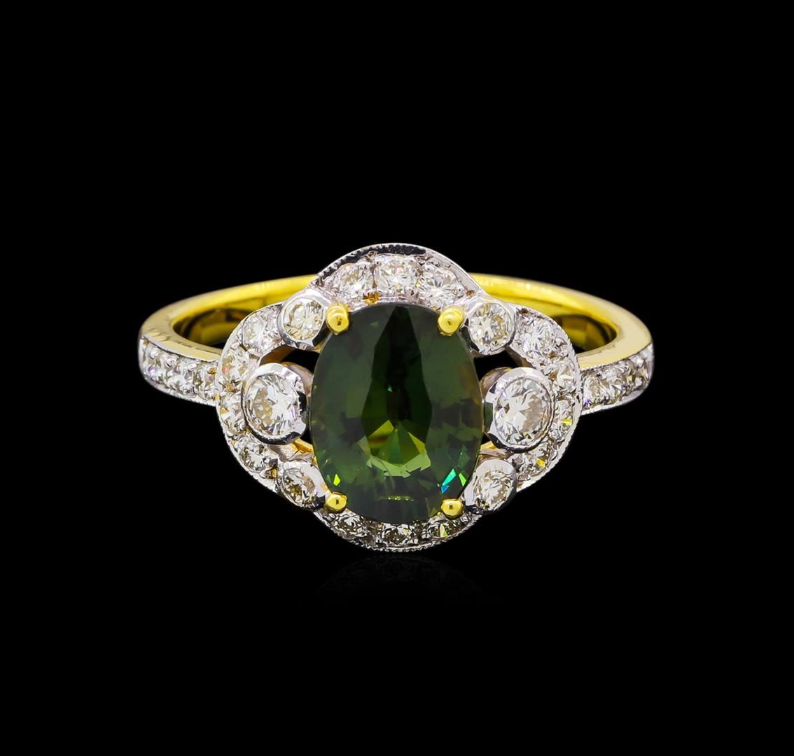 One electronically tested 18KT yellow gold ladies cast green sapphire and diamond ring. The featured green sapphire is set within a stylized diamond bezel supported by diamond set shoulders, completed by a two millimeter wide band. Bright polish finish with rhodium accents. Condition is good. Containing: One prong set oval mixed cut natural green sapphire, measuring 9.10 x 7.00. x 4.50mm, approximate weight of 2.45ct., clarity is slightly included, type II, dark, very slightly grayish, green color, (GIA G 7/3), cut is good. Transmitting light with a minimum of distortion, transparent. Naturally occurring internal & external characteristics are present. Graded in the setting. Two bezel set round brilliant cut diamonds, measuring 2.20 - 2.20 x 1.32mm (depth est.) approximate total weight of 2 Stones = 0.08ct. Graded in the setting. Clarity: VS-2 to SI-1 . Color: H - I Four bezel set round brilliant cut diamonds, measuring 2.00. - 1.90 x 1.17mm (depth est.) approximate total weight of 4 Stones = 0.11ct. Graded in the setting. Clarity: VS-2 to SI-1 . Color: I - J Fourteen prong set round brilliant cut diamonds, measuring 2.80 - 1.70 x 1.35mm (depth est.) approximate total weight of 14 Stones = 0.58ct. Graded in the setting. Clarity: VS-2 to SI-2 . Color: G - I Eight prong set round brilliant cut diamonds, measuring 1.60 - 1.50 x 0.93mm (depth est.) approximate total weight of 8 Stones = 0.12ct. Graded in the setting. Clarity: VS-2 to SI-2 . Color: G - I. Total Weight of Colored Stones 2.45ct.. Total Weight of Diamonds 0.89ct.. Total Weight of Ring 5.11gm. AIG Appraised at $5,720.00.