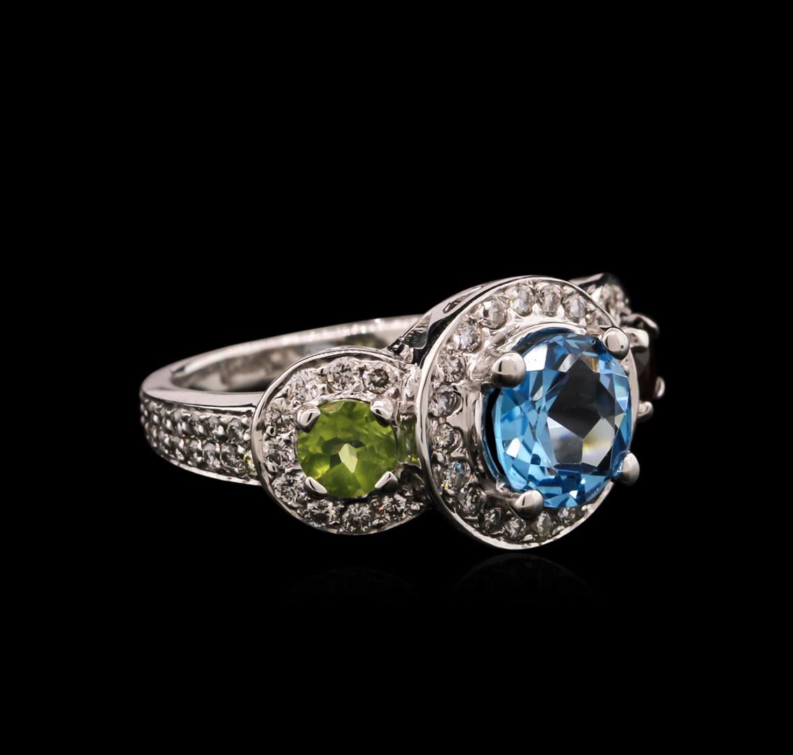 One ring featuring: 14KT white gold weighing 2.38 grams containing one prong set round cut aquamarine center stone with a total weight of 2.45ct, one prong set round cut peridot with a total weight of 0.50ct, one prong set round cut garnet with a total weight of 0.40ct, and pave set round diamonds with a total weight of 0.50ct.