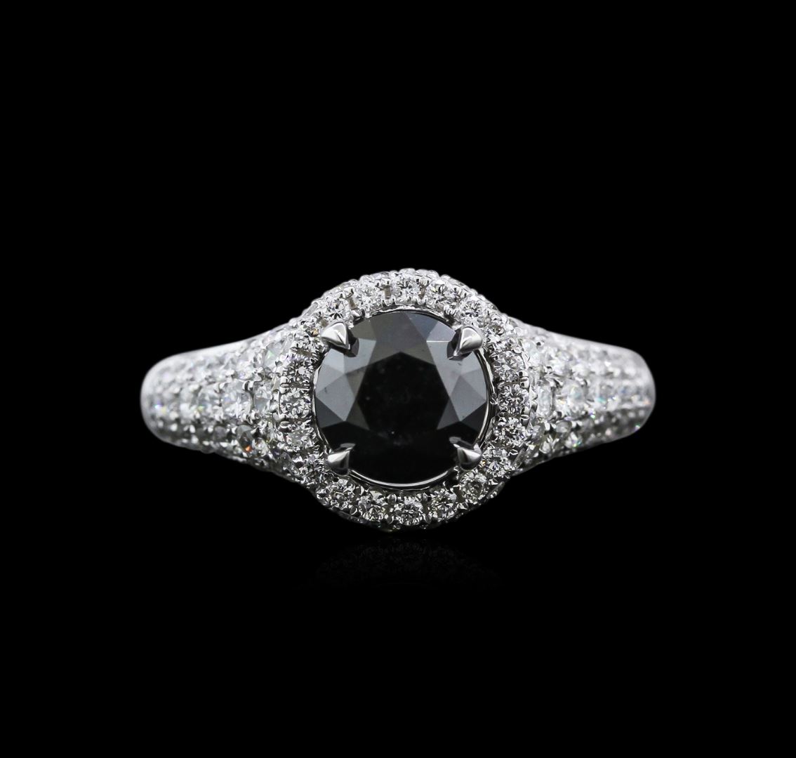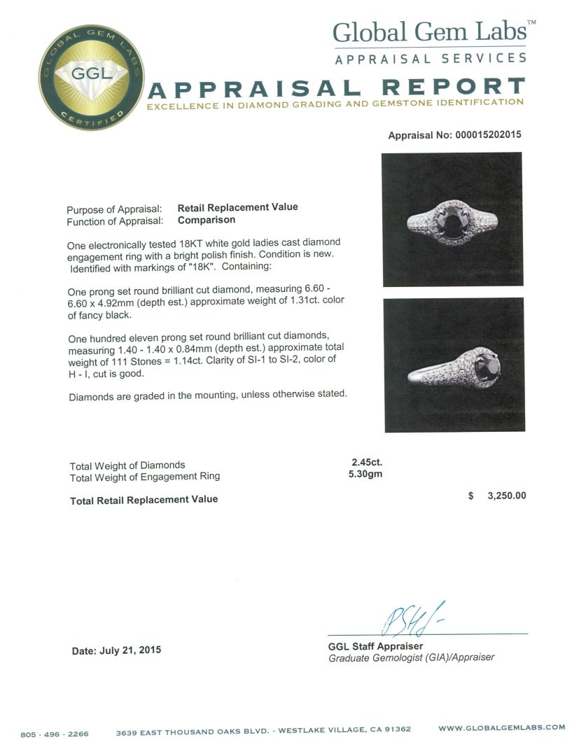 One electronically tested 18KT white gold ladies cast diamond engagement ring with a bright polish finish. Identified with markings of "18K". Condition is new. Containing: One prong set round brilliant cut diamond, measuring 6.60 - 6.60 x 4.92mm (depth est.) approximate weight of 1.31ct. color of fancy black. One Hundred Eleven prong set round brilliant cut diamonds, measuring 1.40 - 1.40 x 0.84mm (depth est.) approximate total weight of 111 Stones = 1.14ct. Clarity: SI-1 to SI-2. Color: H - I, Cut is Good. Diamonds are graded in the mounting, unless otherwise stated. Total Weight of Diamonds 2.45ct. Total Weight of Engagement Ring 5.30gm. GGL Appraised at $3,250.00.