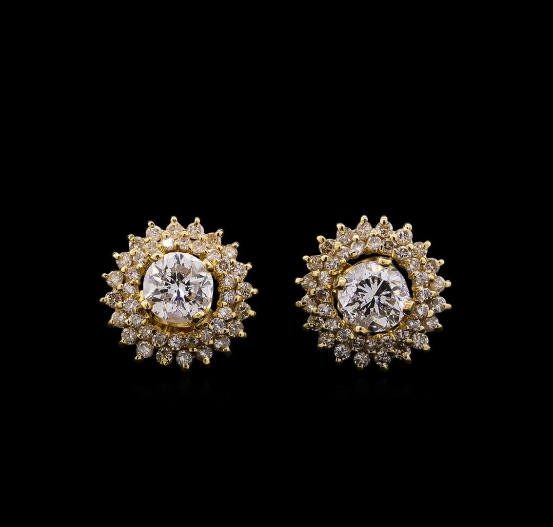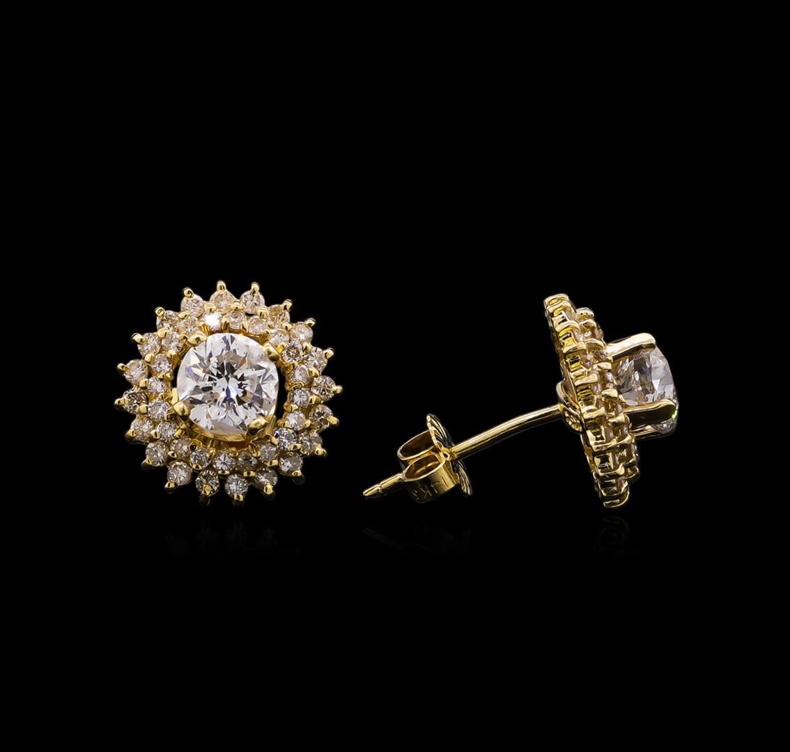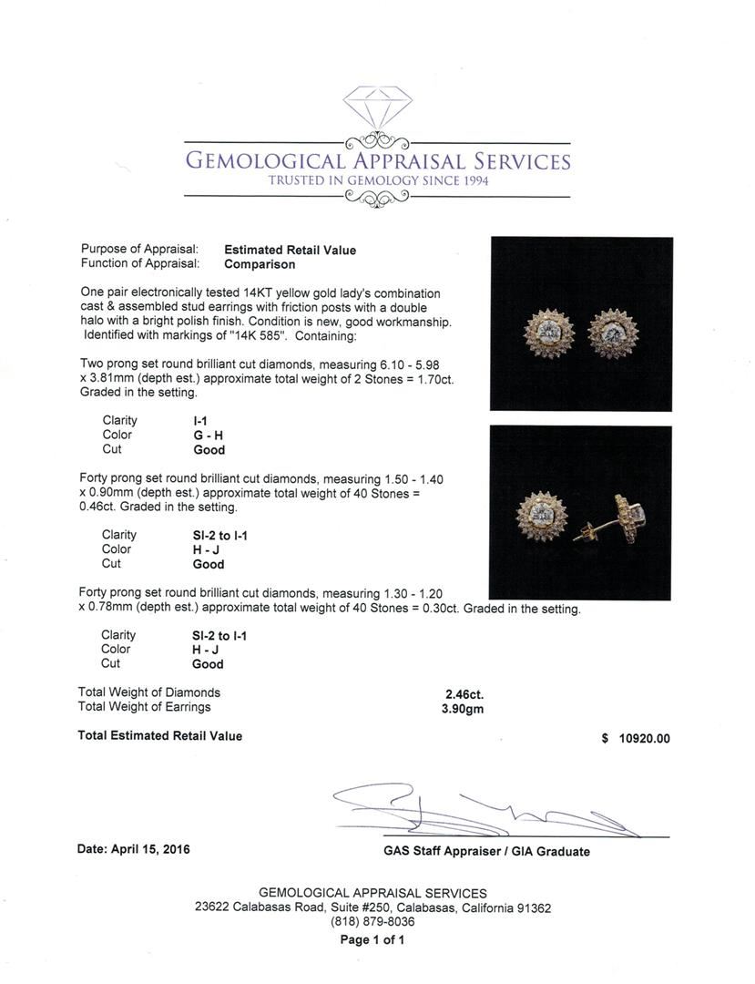 One pair electronically tested 14KT yellow gold lady's combination cast & assembled stud earrings with friction posts with a double halo with a bright polish finish. Identified with markings of "14K 585". Condition is new, good workmanship. Containing: Two prong set round brilliant cut diamonds, measuring 6.10 - 5.98 x 3.81mm (depth est.) approximate total weight of 2 Stones = 1.70ct. Graded in the setting. Clarity: I-1. Color: G - Good Forty prong set round brilliant cut diamonds, measuring 1.50 - 1.40 x 0.90mm (depth est.) approximate total weight of 40 Stones = 0.46ct. Graded in the setting. Clarity: SI-2 to I-1. Color: H - J. Cut Good Forty prong set round brilliant cut diamonds, measuring 1.30 - 1.20 x 0.78mm (depth est.) approximate total weight of 40 Stones = 0.30ct. Graded in the setting. Clarity: SI-2 to I-1. Color: H - Good. Total Weight of Diamonds 2.46ct. Total Weight of Earrings 3.90gm. GAS Appraised at $10,920.00.