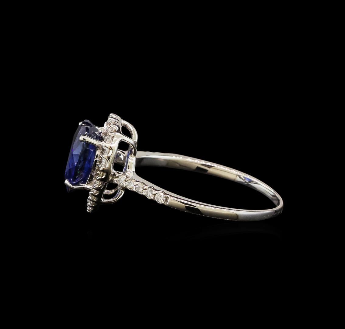One electronically tested 18KT white gold lady's cast fashion heart shape ring with a basket halo with a bright polish finish. The featured lady's ring has a shank measuring 1.20 millimeters wide. Identified with markings of '18K'. Condition is new, good workmanship. Containing: One prong set heart modified brilliant cut natural blue sapphire, measuring 8.35 x 8.50 x 4.52mm, (depth est.) approximate weight of 2.46ct., clarity is eye clean, medium, moderately strong, blue color, (GIA B 5/4), cut is very good. Transmitting light with no distortion, transparent. Colored gemstones are presumed to have been subjected to commonly used enhancement processes. Graded in the setting. Thirty-Six prong set round brilliant cut diamonds, measuring 1.35 - 1.25 x 0.81mm (depth est.) approximate total weight of 36 Stones = 0.30ct. Graded in the setting. Clarity VS-2 to SI-2. Color: H - I Cut Good. Total Weight of Colored Stones 2.46ct.. Total Weight of Diamonds 0.30ct.. Total Weight of Ring 3.00gm. GAS Appraised at $10,350.00.