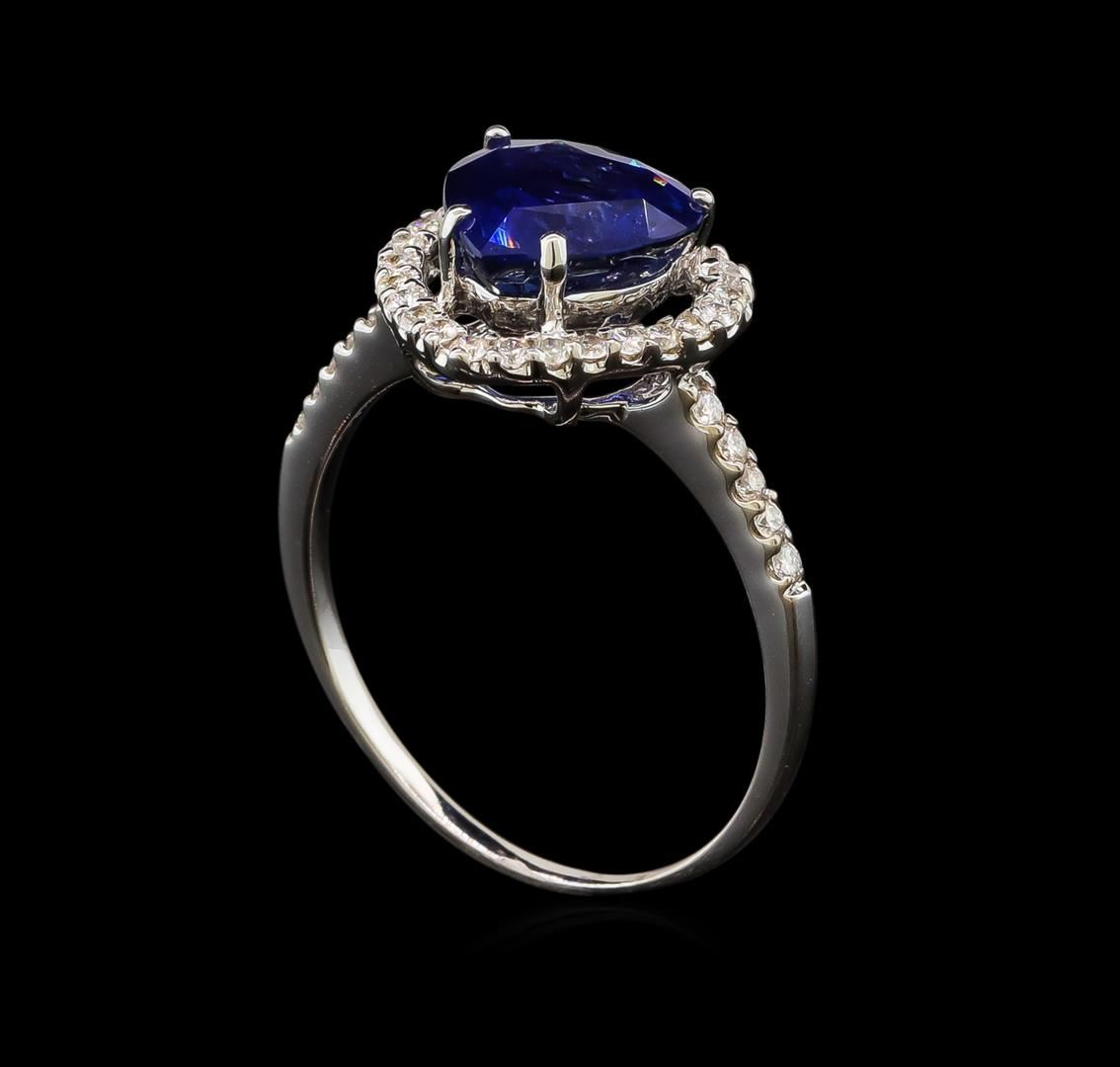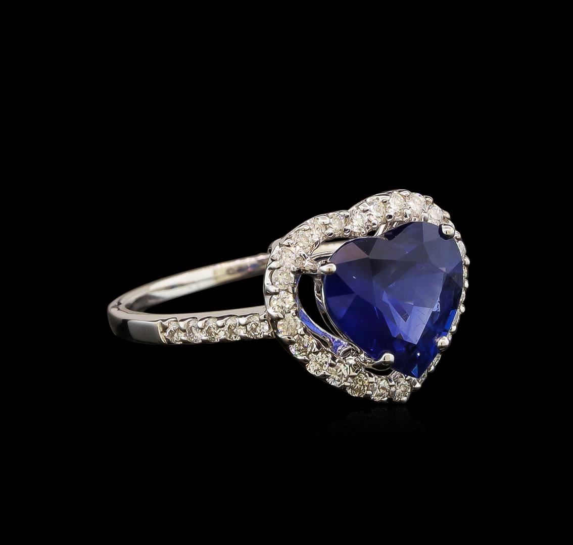 One electronically tested 18KT white gold lady's cast fashion heart shape ring with a basket halo with a bright polish finish. The featured lady's ring has a shank measuring 1.20 millimeters wide. Identified with markings of '18K'. Condition is new, good workmanship. Containing: One prong set heart modified brilliant cut natural blue sapphire, measuring 8.35 x 8.50 x 4.52mm, (depth est.) approximate weight of 2.46ct., clarity is eye clean, medium, moderately strong, blue color, (GIA B 5/4), cut is very good. Transmitting light with no distortion, transparent. Colored gemstones are presumed to have been subjected to commonly used enhancement processes. Graded in the setting. Thirty-Six prong set round brilliant cut diamonds, measuring 1.35 - 1.25 x 0.81mm (depth est.) approximate total weight of 36 Stones = 0.30ct. Graded in the setting. Clarity VS-2 to SI-2. Color: H - I Cut Good. Total Weight of Colored Stones 2.46ct.. Total Weight of Diamonds 0.30ct.. Total Weight of Ring 3.00gm. GAS Appraised at $10,350.00.