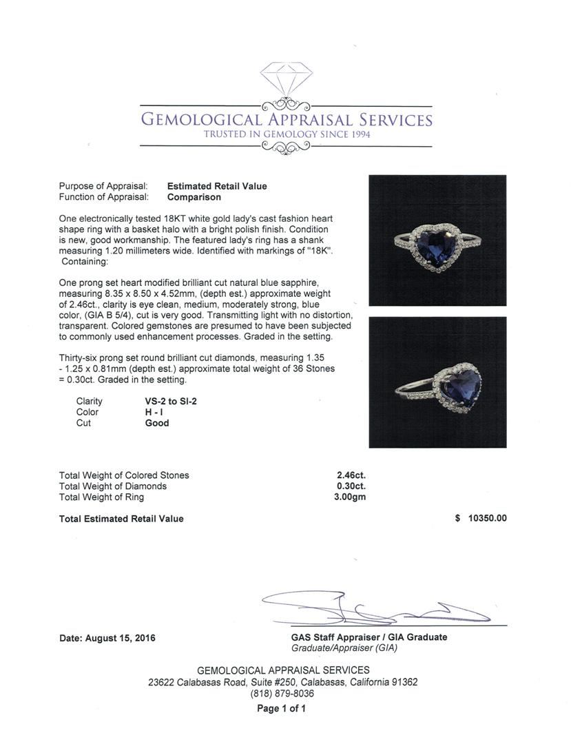 One electronically tested 18KT white gold lady's cast fashion heart shape ring with a basket halo with a bright polish finish. The featured lady's ring has a shank measuring 1.20 millimeters wide. Identified with markings of '18K'. Condition is new, good workmanship. Containing: One prong set heart modified brilliant cut natural blue sapphire, measuring 8.35 x 8.50 x 4.52mm, (depth est.) approximate weight of 2.46ct., clarity is eye clean, medium, moderately strong, blue color, (GIA B 5/4), cut is very good. Transmitting light with no distortion, transparent. Colored gemstones are presumed to have been subjected to commonly used enhancement processes. Graded in the setting. Thirty-Six prong set round brilliant cut diamonds, measuring 1.35 - 1.25 x 0.81mm (depth est.) approximate total weight of 36 Stones = 0.30ct. Graded in the setting. Clarity VS-2 to SI-2. Color: H - I Cut Good. Total Weight of Colored Stones 2.46ct.. Total Weight of Diamonds 0.30ct.. Total Weight of Ring 3.00gm. GAS Appraised at $10,350.00.
