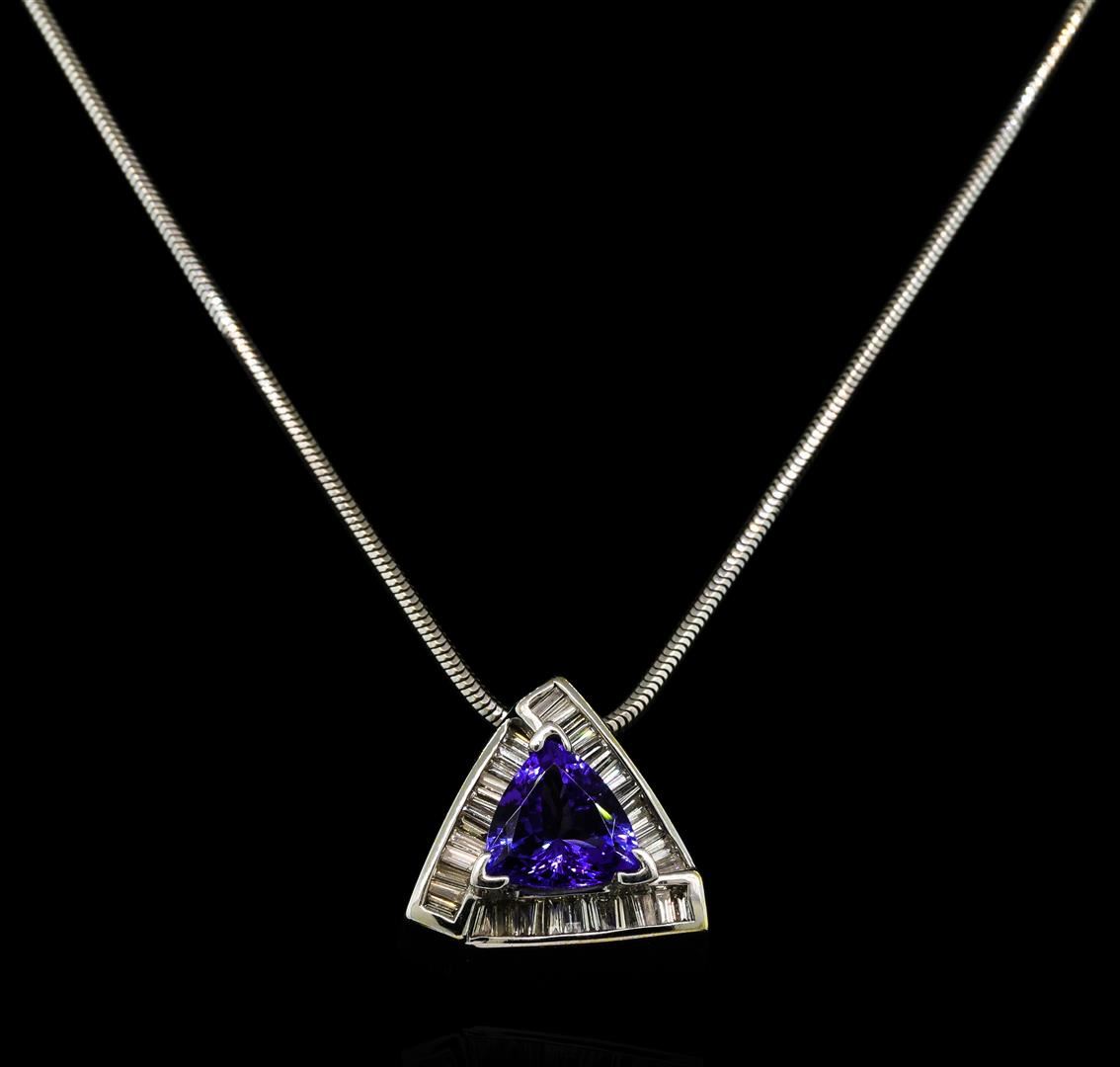 One electronically tested 14KT white gold ladies cast & assembled tanzanite and diamond pendant with chain. The pendant features a tanzanite set within a diamond ribbon bezel completed by lattice under gallery and a hidden bail. The pendant is supported by a sixteen inch length 14KT white gold snake chain, terminating in a lobster claw clasp. Bright polish finish. Identified with markings of '14K'. Condition is good. Containing: One prong set triangle mixed cut natural tanzanite, measuring 9.00 x 9.00 x 4.80mm, 5%. bulge factor, approximate weight of 2.46ct., clarity is eye clean, type I, medium dark, very slightly grayish, bluish violet color, (GIA bevy 6/3), cut is good. Transmitting light with no distortion, transparent. Graded in the setting. Tanzanite is a very rare gemstone that is only found in the country of Tanzania. Originally discovered in 1967. Tiffany & Company, named the stone Tanzanite. It is found in the Usumburu Mountains that border the Umba Valley of northern Tanzania. Tanzanite occurs in gray, brown, violet, blue, reddish-purple, & green. The gem is interesting because of its exceptional pleochroism. Rotated in different directions a tanzanite will exhibit multiple changes of color. Tanzanite has a low tolerance to ultrasonic cleaning, and should not be cleaned using this method. Thirty-Seven channel set baguette cut (tapered) diamonds, measuring from 2.20 x 0.60 x 0.42mm (depth est.) to 2.30 x 1.20 x 0.84mm (depth est.) approximate total weight of 37 Stones = 0.45ct. Graded in the setting. Clarity VS-2 to SI-2. Color: G - I. Total Weight of Colored Stones 2.46ct.. Total Weight of Diamonds 0.45ct.. Total Weight of Pendant With Chain 10.84gm. AIG Appraised at $7,905.00.