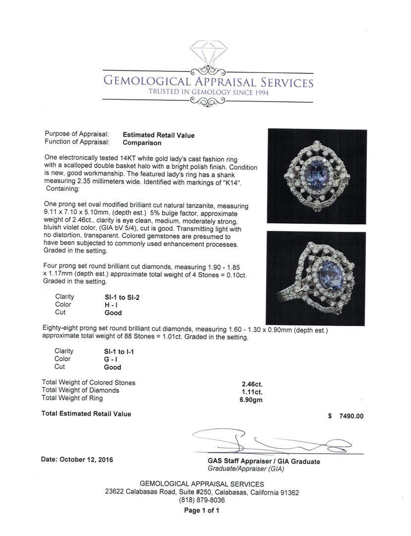 One electronically tested 14KT white gold lady's cast fashion ring with a scalloped double basket halo with a bright polish finish. The featured lady's ring has a shank measuring 2.35 millimeters wide. Identified with markings of 'K14'. Condition is new, good workmanship. Containing: One prong set oval modified brilliant cut natural tanzanite, measuring 9.11 x 7.10 x 5.10mm, (depth est.) 5%. bulge factor, approximate weight of 2.46ct., clarity is eye clean, medium, moderately strong, bluish violet color, (GIA bV 5/4), cut is good. Transmitting light with no distortion, transparent. Colored gemstones are presumed to have been subjected to commonly used enhancement processes. Graded in the setting. Four prong set round brilliant cut diamonds, measuring 1.90 - 1.85 x 1.17mm (depth est.) approximate total weight of 4 Stones = 0.10 ct. Graded in the setting. Clarity SI-1 to SI-2. Color: H - I Cut Good Eighty-Eight prong set round brilliant cut diamonds, measuring 1.60 - 1.30 x 0.90mm (depth est.) approximate total weight of 88 Stones = 1.01ct. Graded in the setting. Clarity SI-1 to I-1. Color: G - I Cut Good. Total Weight of Colored Stones 2.46ct.. Total Weight of Diamonds 1.11ct.. Total Weight of Ring 6.90gm. GAS Appraised.
