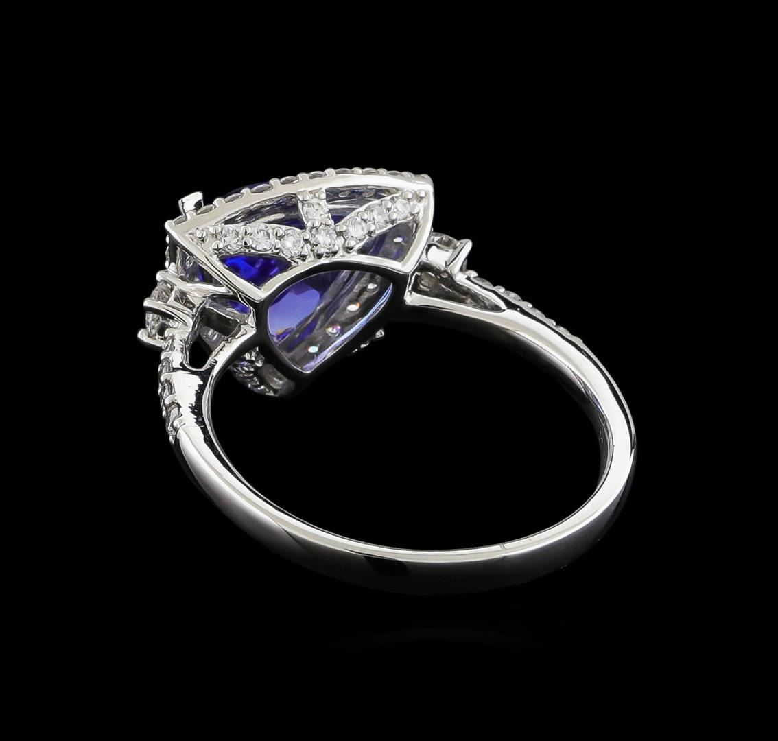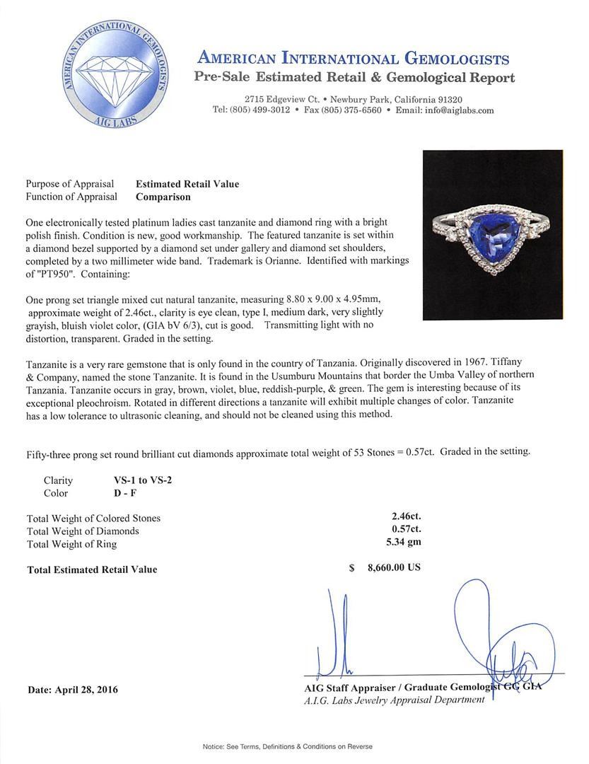 One electronically tested platinum ladies cast tanzanite and diamond ring with a bright polish finish. The featured tanzanite is set within a diamond bezel supported by a diamond set under gallery and diamond set shoulders, completed by a two millimeter wide band. Trademark is Orianne. Identified with markings of "PT950". Condition is new, good workmanship. Containing: One prong set triangle mixed cut natural tanzanite, measuring 8.80 x 9.00 x 4.95mm, approximate weight of 2.46ct., clarity is eye clean, type I, medium dark, very slightly grayish, bluish violet color, (GIA bV 6/3), cut is good. Transmitting light with no distortion, transparent. Graded in the setting. Tanzanite is a very rare gemstone that is only found in the country of Tanzania. Originally discovered in 1967. Tiffany & Company, named the stone Tanzanite. It is found in the Usumburu Mountains that border the Umba Valley of northern Tanzania. Tanzanite occurs in gray, brown, violet, blue, reddish-purple, & green. The gem is interesting because of its exceptional pleochroism. Rotated in different directions a tanzanite will exhibit multiple changes of color. Tanzanite has a low tolerance to ultrasonic cleaning, and should not be cleaned using this method. Fifty-Three prong set round brilliant cut diamonds approximate total weight of 53 Stones = 0.57ct. Graded in the setting. Clarity: VS-1 to VS-2. Color: D - F. Total Weight of Colored Stones 2.46ct. Total Weight of Diamonds 0.57ct. Total Weight of Ring 5.34gm. AIG Appraised at $8,660.00.
