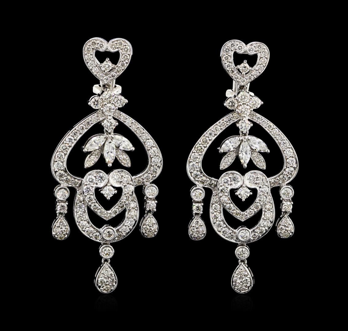 One pair electronically tested 18KT white gold lady's combination cast & assembled chandelier earrings with Omega clip backs with posts with a bright polish with milgrain detailing finish. The featured lady's earring have a dangle measuring 56 millimeters. Identified with markings of '18K'. Condition is new, good workmanship. Containing: Six prong set marquise shaped cut diamonds, measuring 5.40 x 2.70 x 1.70mm (depth est.) approximate total weight of 6 Stones = 0.84ct. Graded in the setting. Color H - I Clarity VS-2 to SI-1 Cut Very Good Twenty-Six bezel set round brilliant cut diamonds, measuring 2.60 - 2.50 x 1.58mm (depth est.) approximate total weight of 26 Stones = 1.63ct. Graded in the setting. Color H - I Clarity VS-2 to SI-1 Cut Very Good One Hundred Sixty-Four prong set round brilliant cut diamonds, measuring 2.00 - 1.60 x 1.08mm (depth est.) approximate total weight of 164 Stones = 2.96ct. Graded in the setting. Color H - I Clarity VS-2 to SI-1 Cut Very Good. Total Weight of Diamonds 5.43ct.. Total Weight of Earrings 21.60gm GAS Appraised at $19485.00. GAS Appraised at $19,485.00.