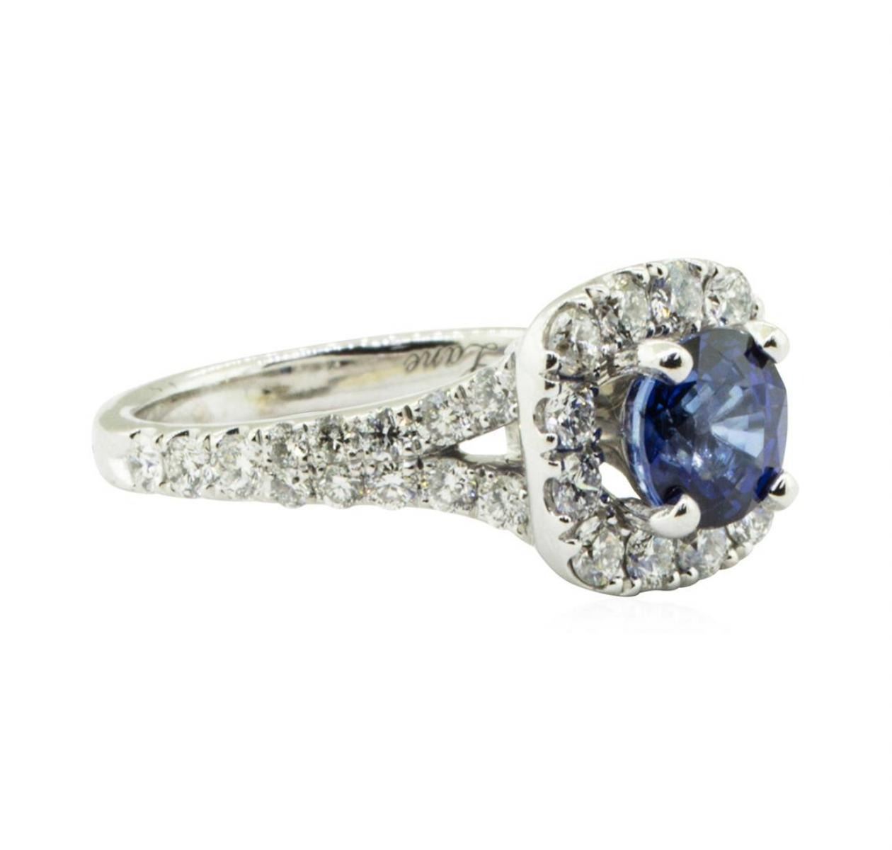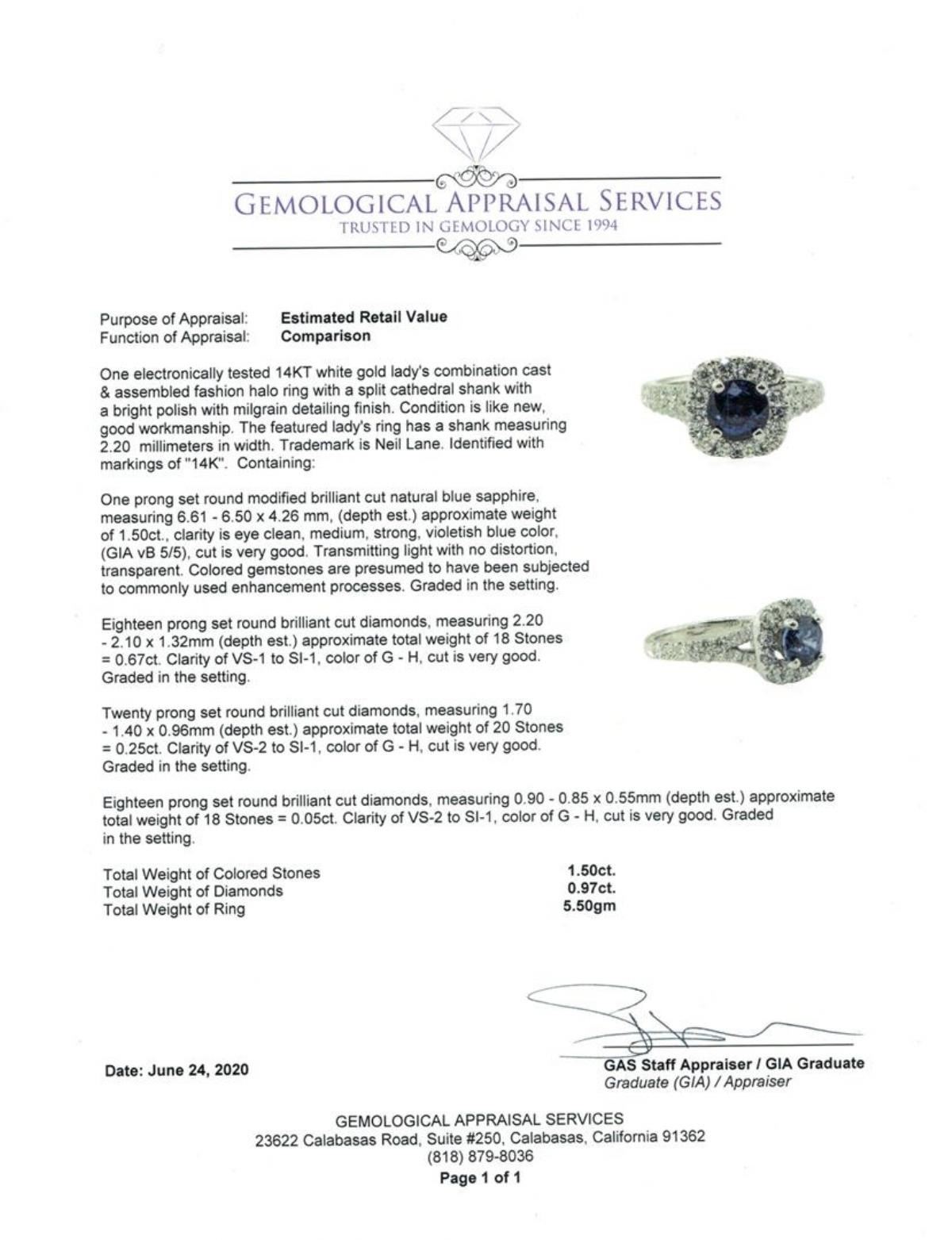 One electronically tested 14KT white gold lady's combination cast & assembled fashion halo ring with a split cathedral shank with a bright polish with milgrain detailing finish. The featured lady's ring has a shank measuring 2.20 millimeters in width. Trademark is Neil Lane. Identified with markings of '14K'. Condition is like new, good workmanship. Containing: One prong set round modified brilliant cut natural blue sapphire, measuring 6.61 - 6.50 x 4.26 mm, (depth est.) approximate weight of 1.50 ct., clarity is eye clean, medium, strong, violetish blue color, (GIA vB 5/5), cut is very good. Transmitting light with no distortion, transparent. Colored gemstones are presumed to have been subjected to commonly used enhancement processes. Graded in the setting. Eighteen prong set round brilliant cut diamonds, measuring 2.20 - 2.10 x 1.32mm (depth est.) approximate total weight of 18 Stones = 0.67ct. Graded in the setting. Color G - H Clarity VS-1 to SI-1 Cut Very Good Twenty prong set round brilliant cut diamonds, measuring 1.70 - 1.40 x 0.96mm (depth est.) approximate total weight of 20 Stones = 0.25ct. Graded in the setting. Color G - H Clarity VS-2 to SI-1 Cut Very Good Eighteen prong set round brilliant cut diamonds, measuring 0.90 - 0.85 x 0.55mm (depth est.) approximate total weight of 18 Stones = 0.05ct. Graded in the setting. Color G - H Clarity VS-2 to SI-1 Cut Very Good. Total Weight of Colored Stones 1.50 ct.. Total Weight of Diamonds 0.97ct.. Total Weight of Ring 5.50gm GAS Appraised at $7165.00. GAS Appraised.