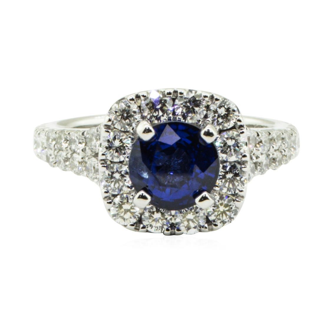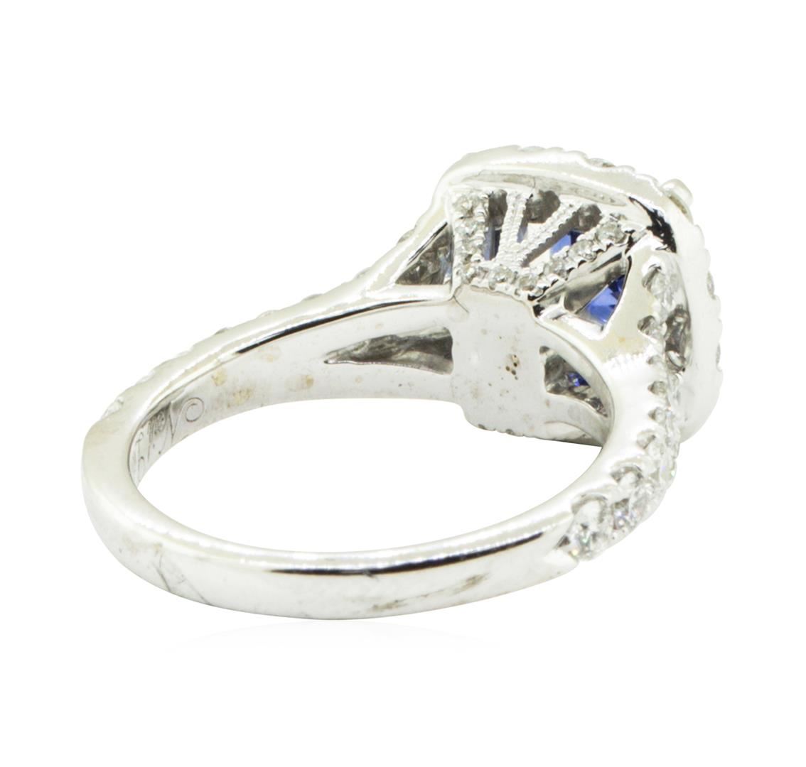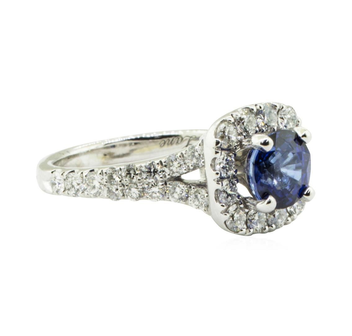 One electronically tested 14KT white gold lady's combination cast & assembled fashion halo ring with a split cathedral shank with a bright polish with milgrain detailing finish. The featured lady's ring has a shank measuring 2.20 millimeters in width. Tra