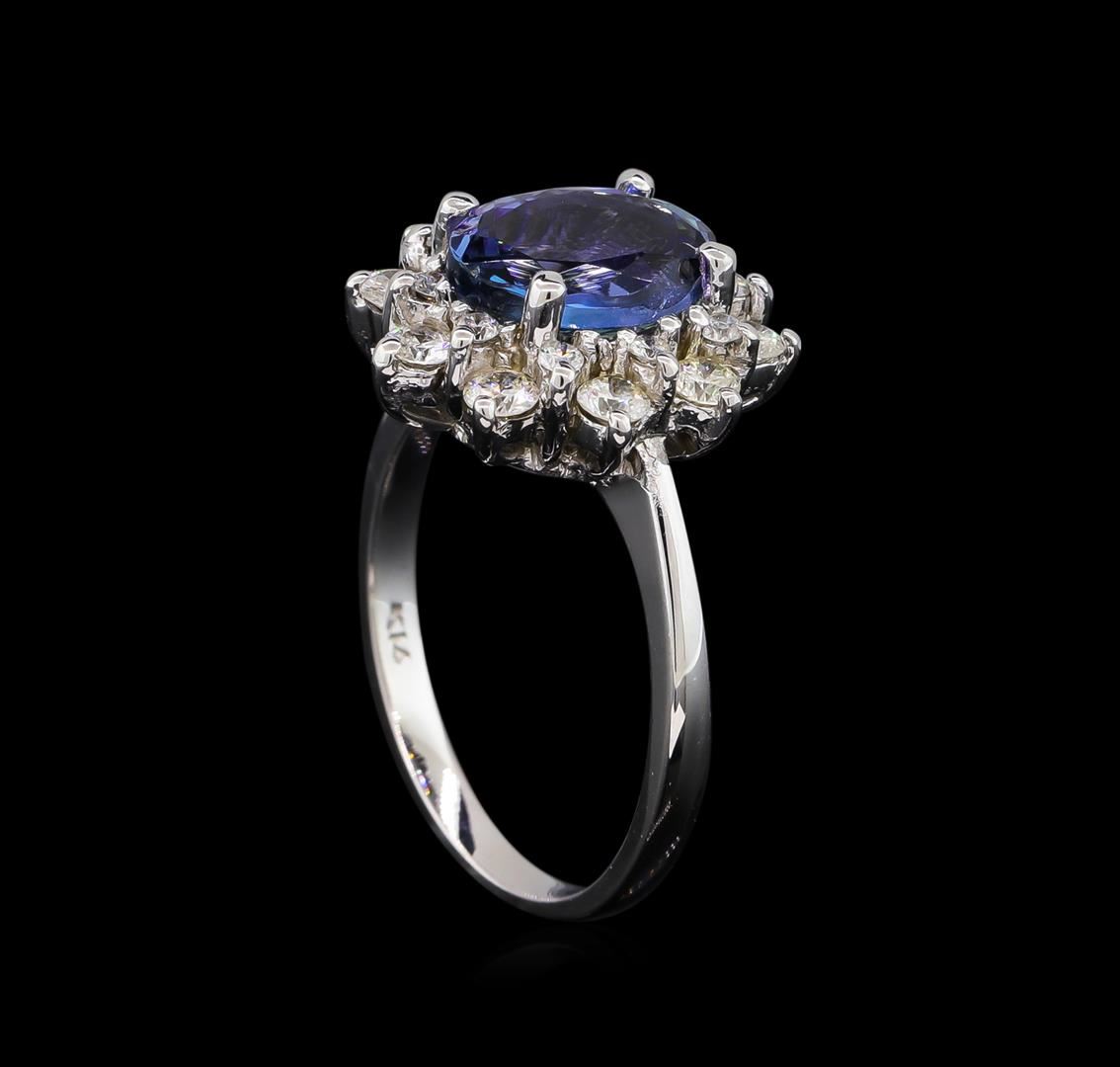 One electronically tested 14KT white gold lady's cast fashion ring with a basket halo with a bright polish finish. The featured lady's ring has a shank measuring 1.91 millimeters wide. Identified with markings of "K14". Condition is new, good workmanship. Containing: One prong set oval modified brilliant cut natural tanzanite, measuring 9.74 x 7.44 x 4.27mm, 13%. bulge factor, approximate weight of 2.47ct., clarity is eye clean, type I, medium light, very slightly grayish, bluish violet color, (GIA bV 4/3), cut is good. Transmitting light with no distortion, transparent. Colored gemstones are presumed to have been subjected to commonly used enhancement processes. Graded in the setting. Ten prong set round brilliant cut diamonds, measuring 2.60 - 2.50 x 1.53mm (depth est.) approximate total weight of 10 Stones = 0.60ct. Graded in the setting. Clarity: VS-2 to SI-1. Color: H - I. Cut Good Ten prong set round brilliant cut diamonds, measuring 1.60 - 1.55 x 0.98mm (depth est.) approximate total weight of 10 Stones = 0.15ct. Graded in the setting. Clarity: SI-1 to SI-2. Color: H - I. Cut Good. Total Weight of Colored Stones 2.47ct. Total Weight of Diamonds 0.75ct. Total Weight of Ring 4.80gm. GAS Appraised at $5,275.00.