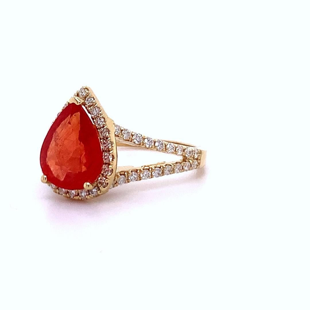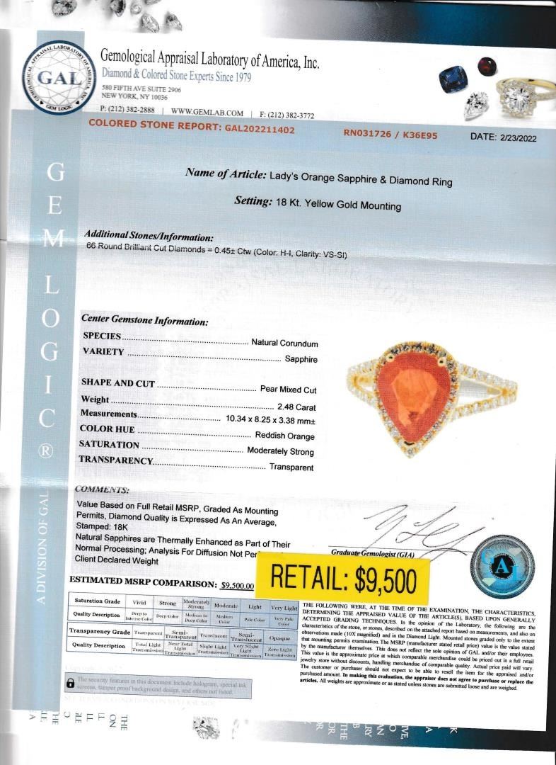 Name of Article: Lady's Orange Sapphire and Diamond Ring; Setting: 18 Kt. Yellow Gold Mounting #Additional Stones/Information:# 66 Round Brilliant Cut Diamonds = 0.45+/- Ctw (Color: H-I, Clarity: VS-SI) #Center Gemstone Information:# SPECIES: Natural Corundum; VARIETY: Sapphire; SHAPE AND CUT: Pear Mixed Cut; Weight: 2.48 Carat; Measurements: 10.34 x 8.25 x 3.38mm; COLOR HUE: Reddish Orange; SATURATION: Moderately Strong; TRANSPARENCY: Transparent #Size: 7