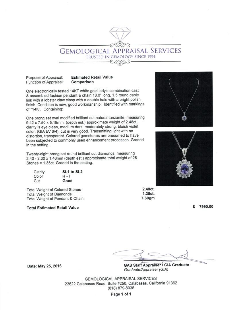One electronically tested 14KT white gold lady's combination cast & assembled fashion pendant & chain 18.0" long, 1.5 round cable link with a lobster claw clasp with a double halo with a bright polish finish. Identified with markings of "14K". Condition is new, good workmanship. Containing: One diamond(depth est.) approximate weight of 0.00ct. One prong set oval modified brilliant cut natural tanzanite, measuring 9.42 x 7.50 x 5.19mm, (depth est.) approximate weight of 2.48ct., clarity is eye clean, medium dark, moderately strong, bluish violet color, (GIA bV 6/4), cut is very good. Transmitting light with no distortion, transparent. Colored gemstones are presumed to have been subjected to commonly used enhancement processes. Graded in the setting. Twenty-Eight prong set round brilliant cut diamonds, measuring 2.40 - 2.30 x 1.46mm (depth est.) approximate total weight of 28 Stones = 1.35ct. Graded in the setting. Clarity: SI-1 to SI-2. Color: H - I. Cut Good. Total Weight of Colored Stones 2.48ct. Total Weight of Diamonds 1.35ct. Total Weight of Pendant & Chain 7.60gm. GAS Appraised at $7,990.00.