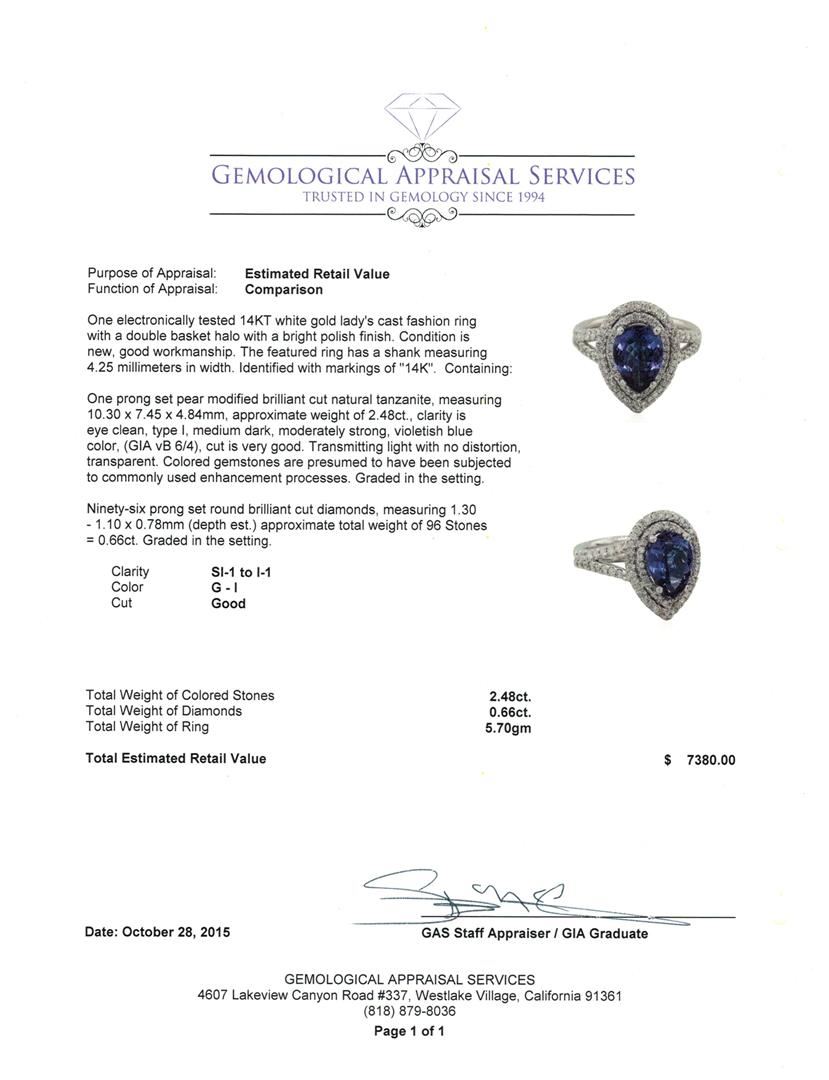 One electronically tested 14KT white gold lady's cast fashion ring with a double basket halo with a bright polish finish. The featured ring has a shank measuring 4.25 millimeters in width. Identified with markings of "14K". Condition is new, good workmanship. Containing: One prong set pear modified brilliant cut natural tanzanite, measuring 10.30 x 7.45 x 4.84mm, approximate weight of 2.48ct., clarity is eye clean, type I, medium dark, moderately strong, violetish blue color, (GIA vB 6/4), cut is very good. Transmitting light with no distortion, transparent. Colored gemstones are presumed to have been subjected to commonly used enhancement processes. Graded in the setting. Ninety-Six prong set round brilliant cut diamonds, measuring 1.30 - 1.10 x 0.78mm (depth est.) approximate total weight of 96 Stones = 0.66ct. Graded in the setting. Clarity: SI-1 to I-1. Color: G - I. Cut Good. Total Weight of Colored Stones 2.48ct. Total Weight of Diamonds 0.66ct. Total Weight of Ring 5.70gm. GAS Appraised at $7,380.00.