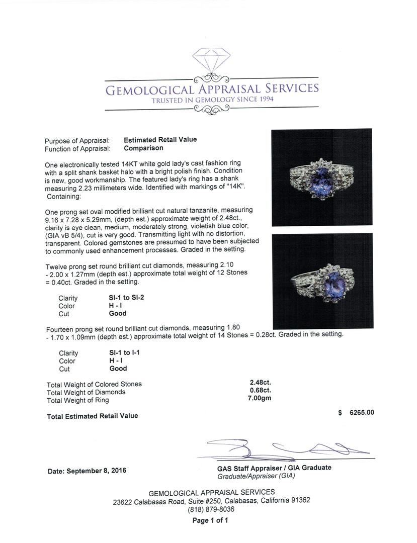 One electronically tested 14KT white gold lady's cast fashion ring with a split shank basket halo with a bright polish finish. The featured lady's ring has a shank measuring 2.23 millimeters wide. Identified with markings of '14K'. Condition is new, good workmanship. Containing: One prong set oval modified brilliant cut natural tanzanite, measuring 9.16 x 7.28 x 5.29mm, (depth est.) approximate weight of 2.48ct., clarity is eye clean, medium, moderately strong, violetish blue color, (GIA vB 5/4), cut is very good. Transmitting light with no distortion, transparent. Colored gemstones are presumed to have been subjected to commonly used enhancement processes. Graded in the setting. Twelve prong set round brilliant cut diamonds, measuring 2.10 - 2.00 x 1.27mm (depth est.) approximate total weight of 12 Stones = 0.40ct. Graded in the setting. Clarity SI-1 to SI-2. Color: H - I Cut Good Fourteen prong set round brilliant cut diamonds, measuring 1.80 - 1.70 x 1.09mm (depth est.) approximate total weight of 14 Stones = 0.28ct. Graded in the setting. Clarity SI-1 to I-1. Color: H - I Cut Good. Total Weight of Colored Stones 2.48ct.. Total Weight of Diamonds 0.68ct.. Total Weight of Ring 7.00gm GAS Appraised at $6,265.00.