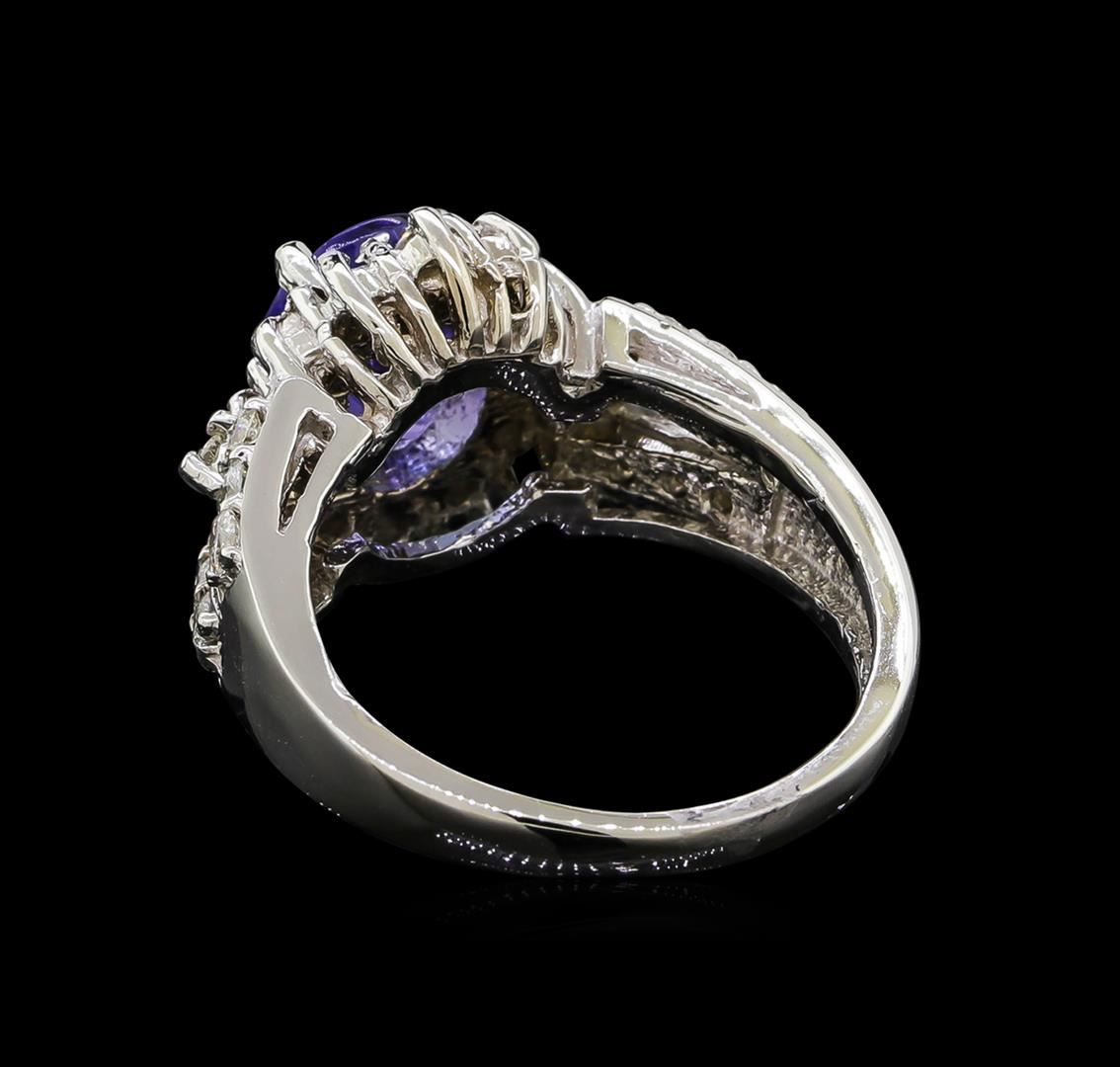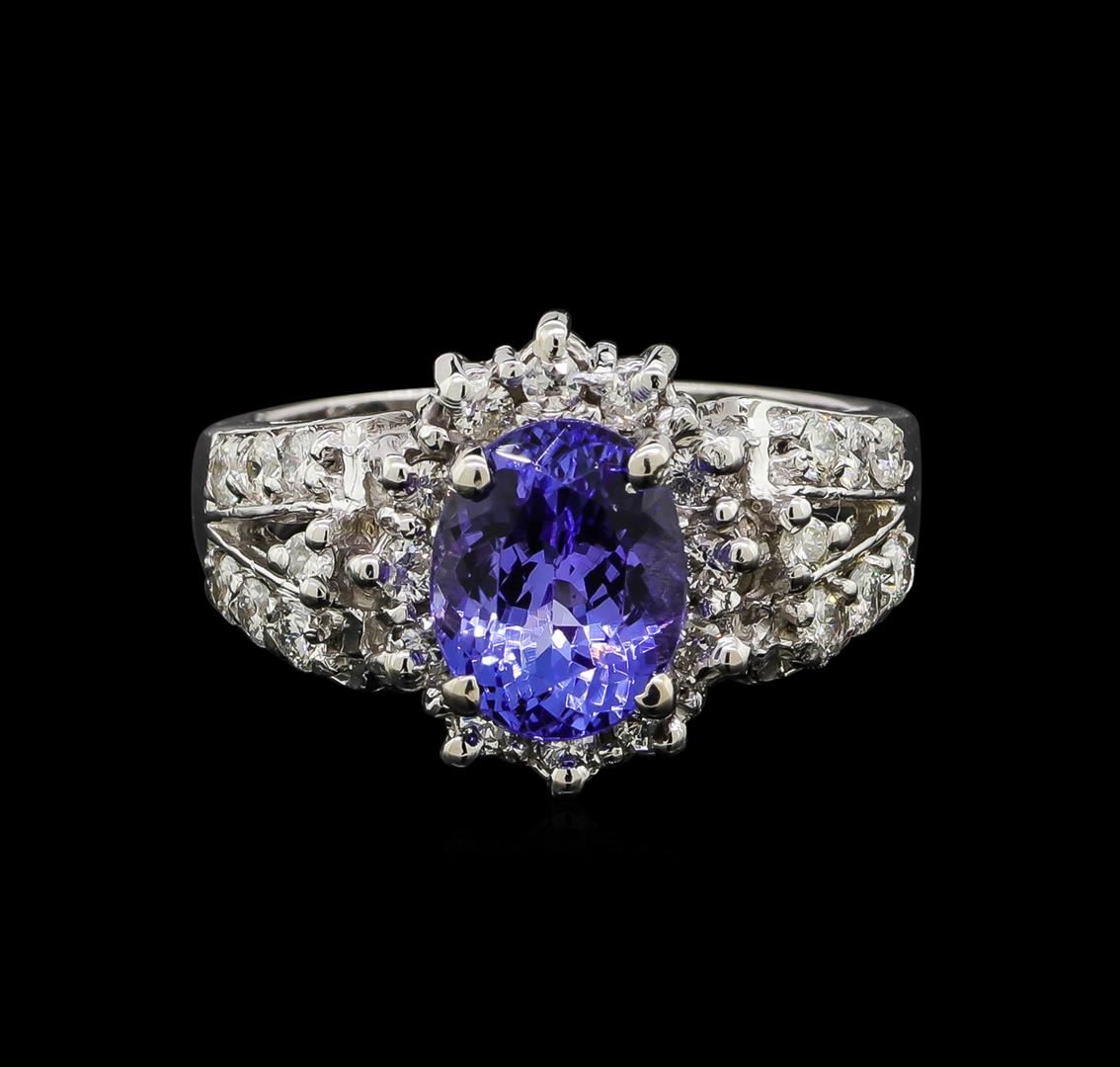 One electronically tested 14KT white gold lady's cast fashion ring with a split shank basket halo with a bright polish finish. The featured lady's ring has a shank measuring 2.23 millimeters wide. Identified with markings of '14K'. Condition is new, good workmanship. Containing: One prong set oval modified brilliant cut natural tanzanite, measuring 9.16 x 7.28 x 5.29mm, (depth est.) approximate weight of 2.48ct., clarity is eye clean, medium, moderately strong, violetish blue color, (GIA vB 5/4), cut is very good. Transmitting light with no distortion, transparent. Colored gemstones are presumed to have been subjected to commonly used enhancement processes. Graded in the setting. Twelve prong set round brilliant cut diamonds, measuring 2.10 - 2.00 x 1.27mm (depth est.) approximate total weight of 12 Stones = 0.40ct. Graded in the setting. Clarity SI-1 to SI-2. Color: H - I Cut Good Fourteen prong set round brilliant cut diamonds, measuring 1.80 - 1.70 x 1.09mm (depth est.) approximate total weight of 14 Stones = 0.28ct. Graded in the setting. Clarity SI-1 to I-1. Color: H - I Cut Good. Total Weight of Colored Stones 2.48ct.. Total Weight of Diamonds 0.68ct.. Total Weight of Ring 7.00gm GAS Appraised at $6,265.00.