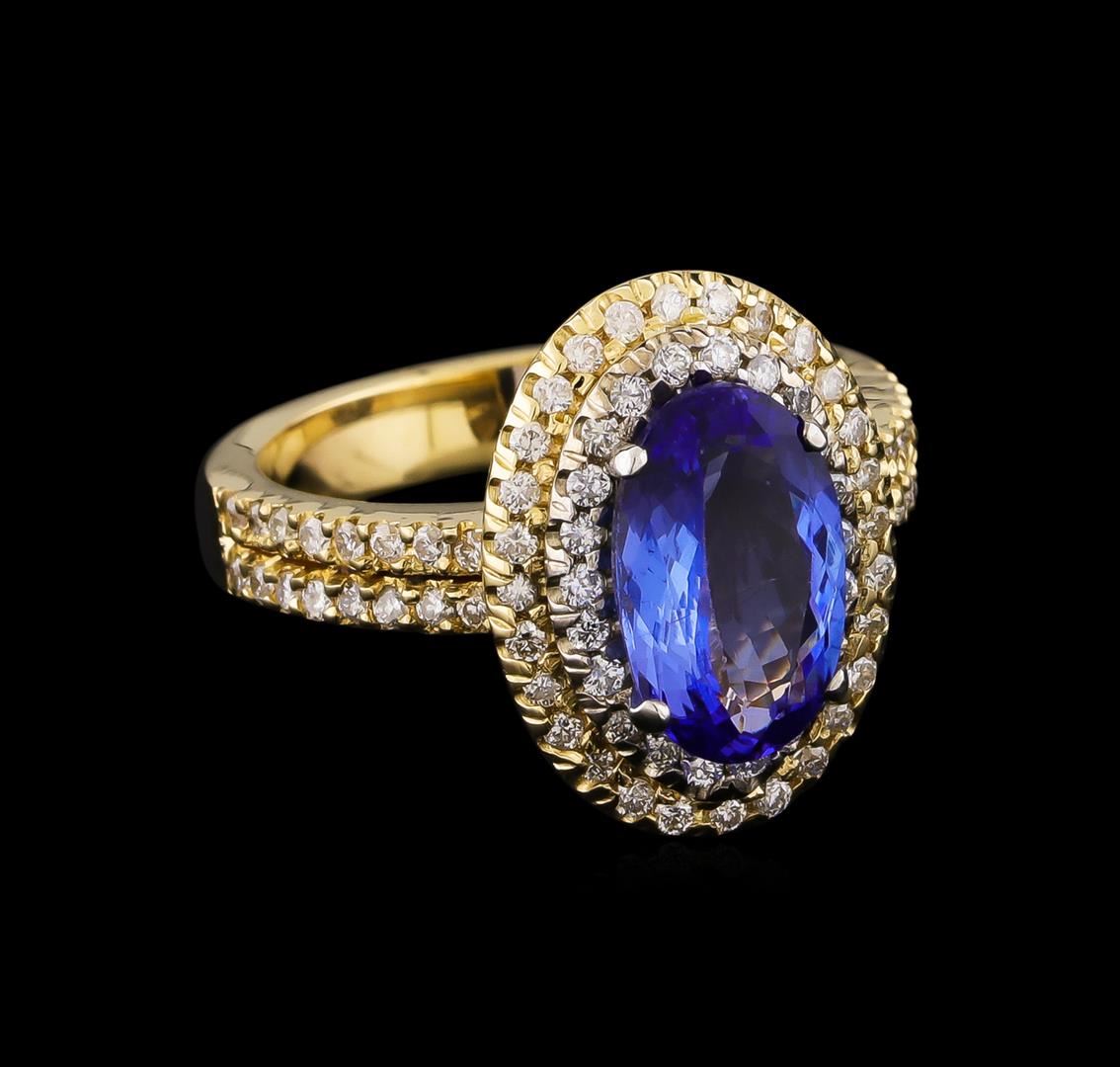 One electronically tested 14KT yellow gold lady's cast fashion ring with a double basket halo with a bright polish finish. The featured lady's ring has a shank measuring 3.36 millimeters wide. Identified with markings of "14K". Condition is new, good workmanship. Containing: One prong set oval modified brilliant cut natural tanzanite, measuring 10.99 x 6.95 x 4.05mm, 15%. bulge factor, approximate weight of 2.48ct., clarity is slightly included, medium light, moderately strong, violetish blue color, (GIA vB 4/4), cut is good. Transmitting light with a minimum of distortion, transparent. Colored gemstones are presumed to have been subjected to commonly used enhancement processes. Graded in the setting. Eighty-Two prong set round brilliant cut diamonds, measuring 1.30 - 1.25 x 0.79mm (depth est.) approximate total weight of 82 Stones = 0.65ct. Graded in the setting. Clarity: SI-1 to SI-2. Color: H - I. Cut Good. Total Weight of Colored Stones 2.48ct. Total Weight of Diamonds 0.65ct. Total Weight of Ring 6.80gm. GAS Appraised at $5,415.00.