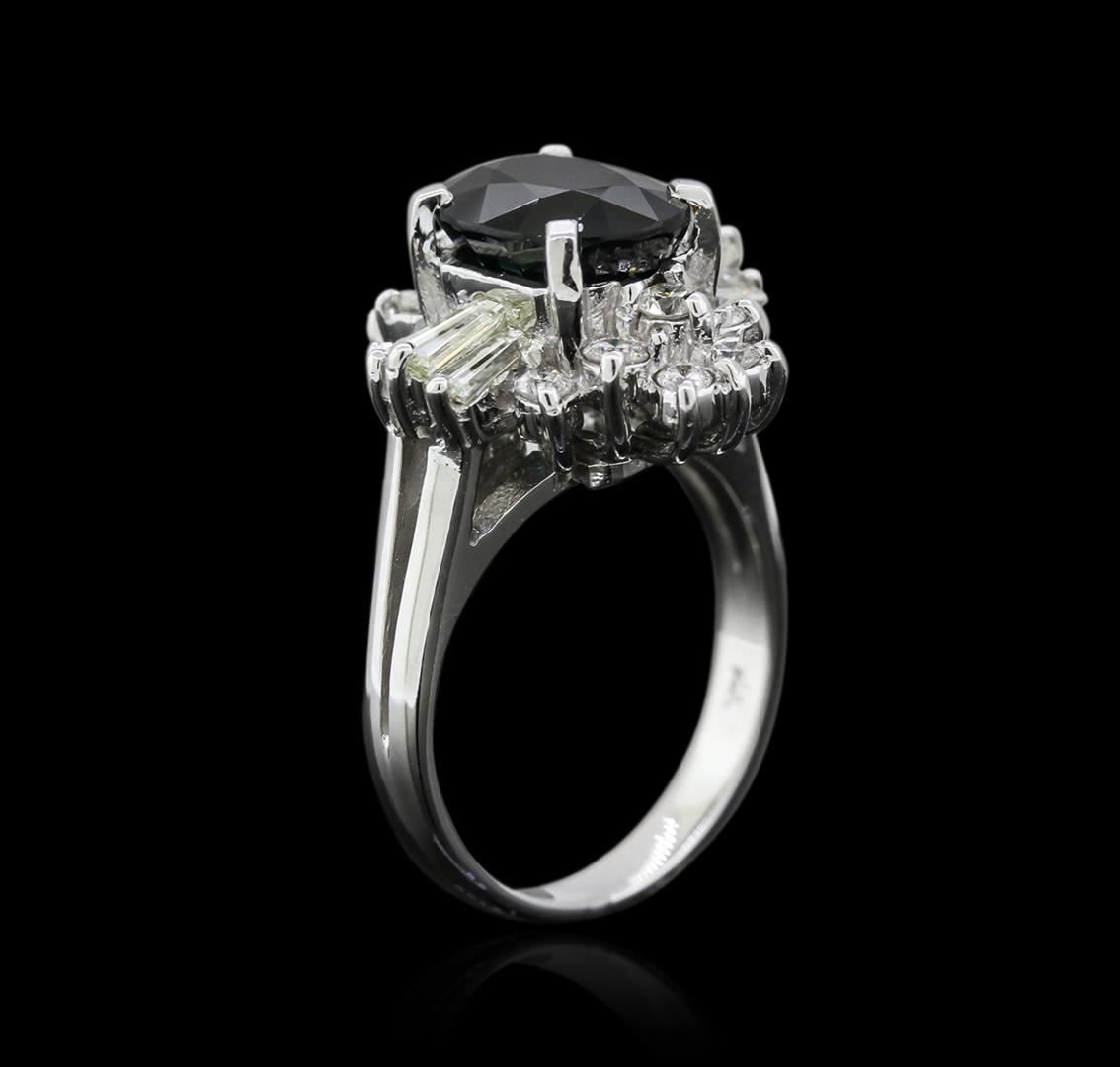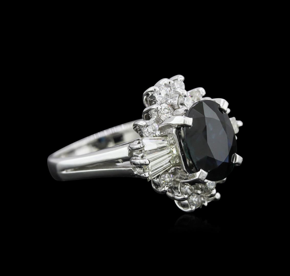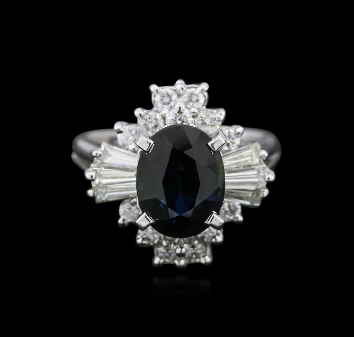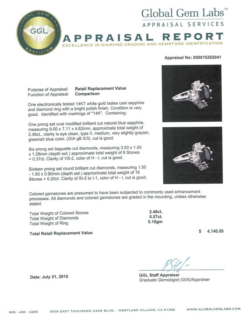 One electronically tested 14KT white gold ladies cast sapphire and diamond ring with a bright polish finish. Identified with markings of "14K". Condition is very good. Containing: One prong set oval modified brilliant cut natural blue sapphire, measuring 9.00 x 7.11 x 4.62mm, approximate total weight of 2.48ct., clarity is eye clean, type II, medium, very slightly grayish, greenish blue color, (GIA gB 5/3), cut is good. Six prong set baguette cut diamonds, measuring 3.50 x 1.50 x 1.28mm (depth est.) approximate total weight of 6 Stones = 0.37ct. Clarity: VS-2. Color: H - I, Cut is Good. Sixteen prong set round brilliant cut diamonds, measuring 1.50 - 1.50 x 0.90mm (depth est.) approximate total weight of 16 Stones = 0.20ct. Clarity: SI-2 to I-1. Color: H - I, Cut is Good. Colored gemstones are presumed to have been subjected to commonly used enhancement processes. All diamonds and colored gemstones are graded in the mounting, unless otherwise stated. Total Weight of Colored Stones 2.48ct. Total Weight of Diamonds 0.57ct. Total Weight of Ring 5.10gm. GGL Appraised at $4,140.00.