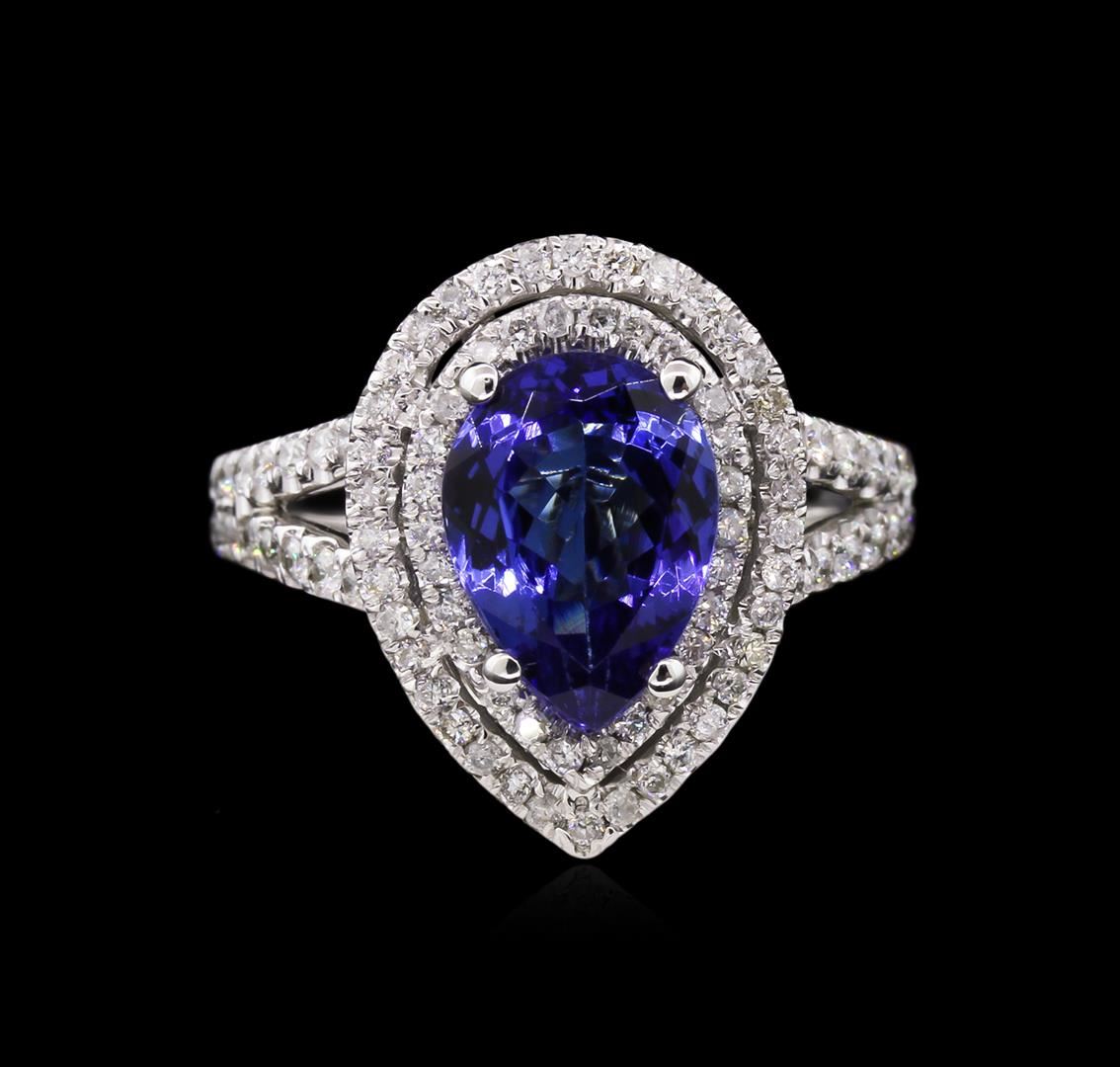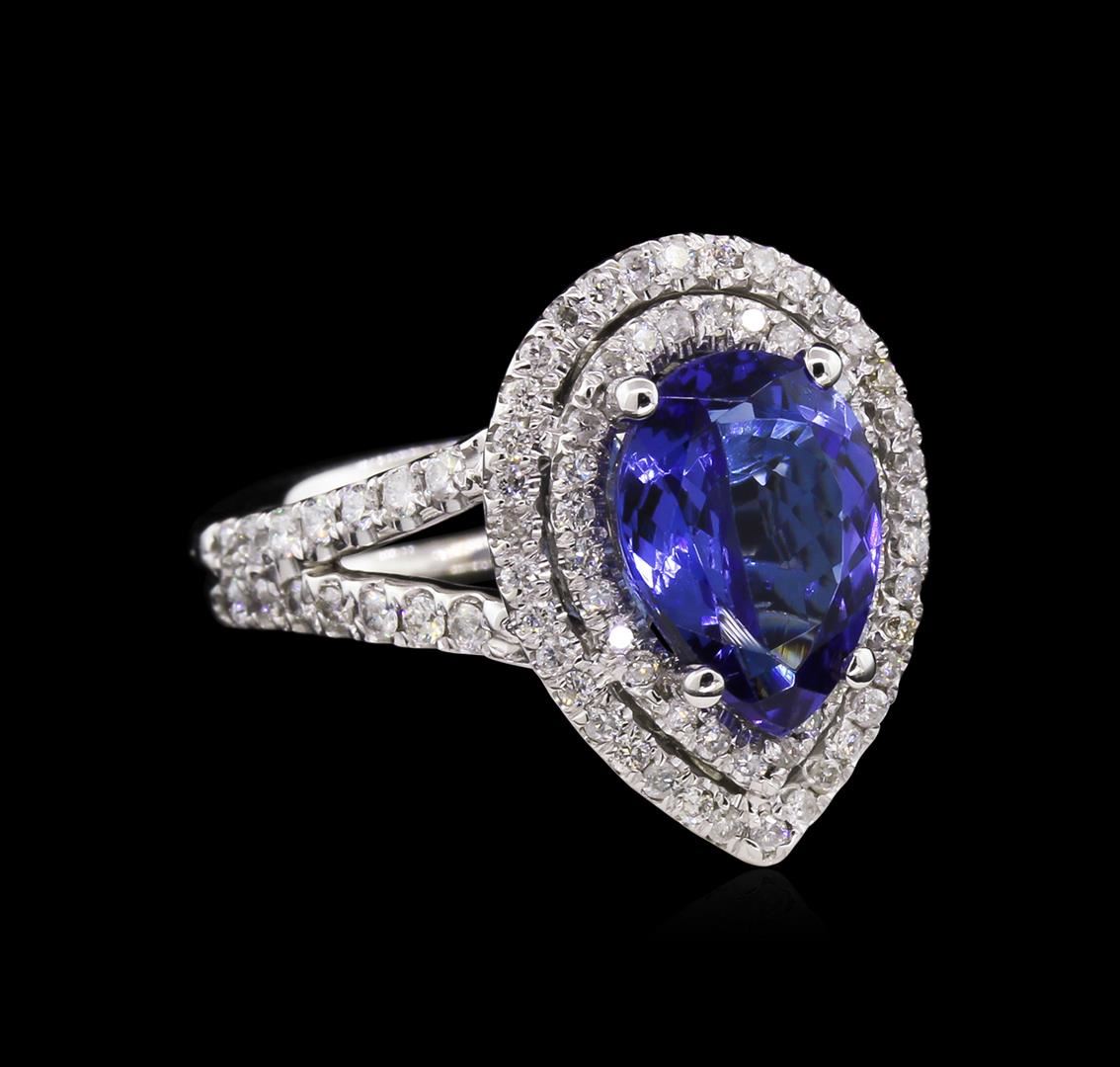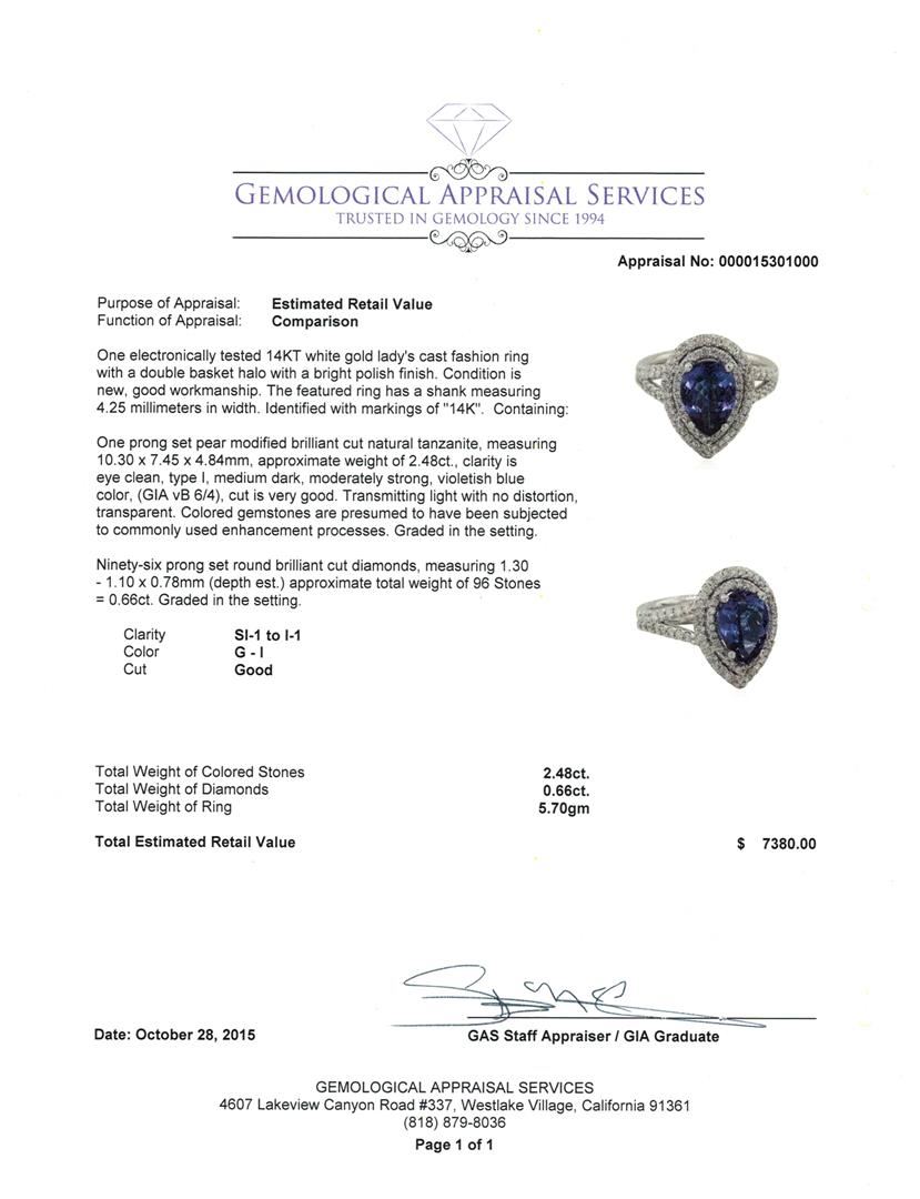 One electronically tested 14KT white gold lady's cast fashion ring with a double basket halo with a bright polish finish. The featured ring has a shank measuring 4.25 millimeters in width. Identified with markings of "14K". Condition is new, good workmanship. Containing: One prong set pear modified brilliant cut natural tanzanite, measuring 10.30 x 7.45 x 4.84mm, approximate weight of 2.48ct., clarity is eye clean, type I, medium dark, moderately strong, violetish blue color, (GIA vB 6/4), cut is very good. Transmitting light with no distortion, transparent. Colored gemstones are presumed to have been subjected to commonly used enhancement processes. Graded in the setting. Ninety-Six prong set round brilliant cut diamonds, measuring 1.30 - 1.10 x 0.78mm (depth est.) approximate total weight of 96 Stones = 0.66ct. Graded in the setting. Clarity: SI-1 to I-1. Color: G - I. Cut Good. Total Weight of Colored Stones 2.48ct. Total Weight of Diamonds 0.66ct. Total Weight of Ring 5.70gm. GAS Appraised at $7,380.00.