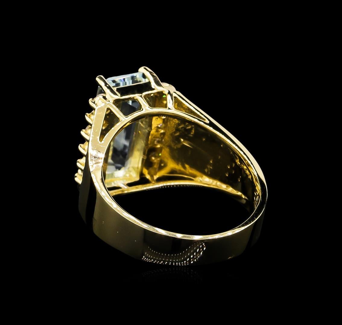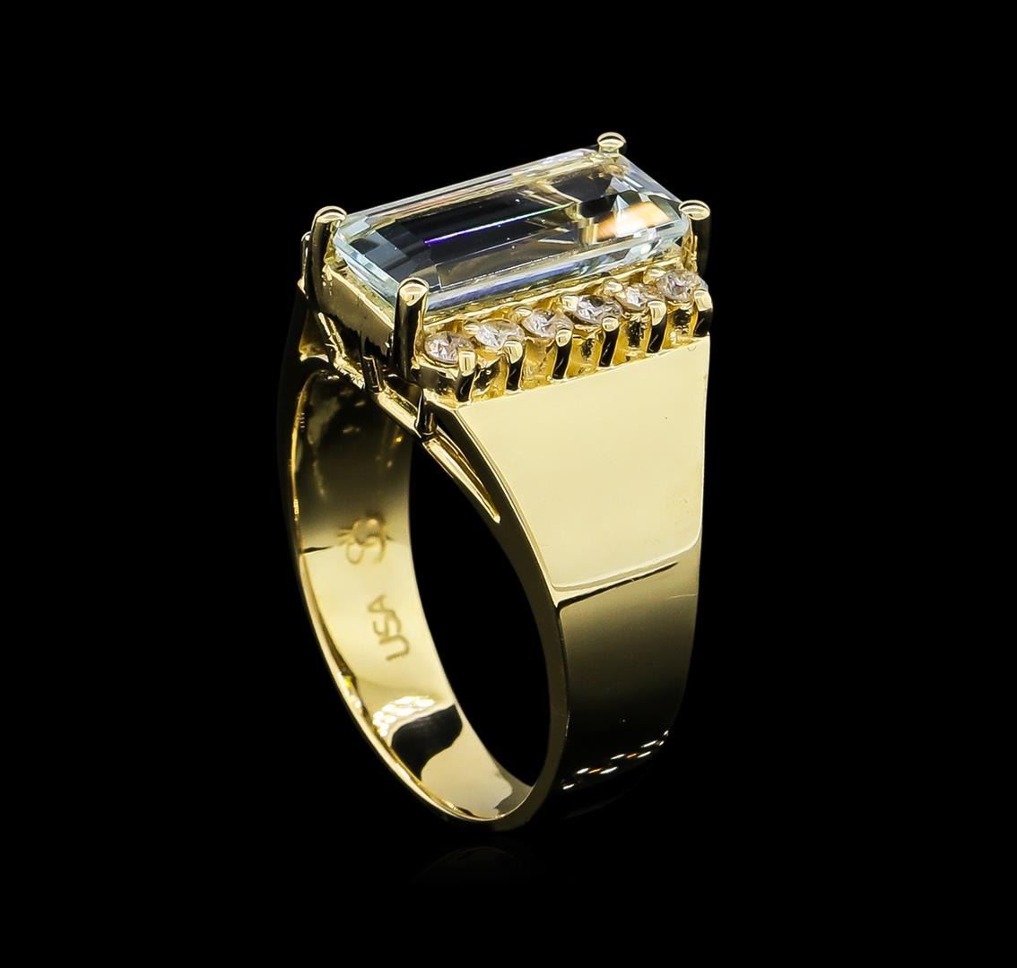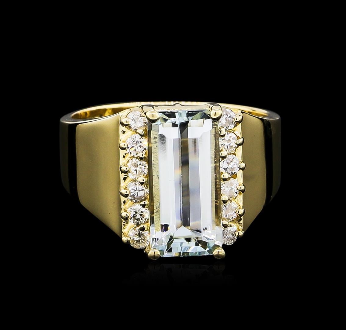 One polished, stamped, and tested 14KT yellow gold ring with a bright polish finish. The ring is mounted with: 1 genuine aquamarine center stone weighing 2.49ct, and 12 genuine round diamonds weighing 0.34ct. This item weighs 6.10 grams, condition is new, excellent workmanship. MAIN GEMSTONE: Species: Natural Beryl. Variety: Aquamarine. Shape: Rectangular cut cornered. Cutting Style: Step cut. Measurements: 12.77 x 6.33 x 4.15mm. Weight: 2.49ct. Color: Very light greenish blue. Cut Grade: Very good. Refractive Index: 1.577 to 1.583 DR. Birefringence: 0.005 - 0.009. Hardness: 7.5 - 8. ADJACENT GEMSTONES ON RING: Identity: Natural diamond. Shape: Round. Cutting Style: Brilliant cut. Quantity: 12 diamonds. Measurements: 1.8mm. Total Weight: 0.34ct. Color Grade: H - I. Clarity Grade: SI1 - SI3. Refractive Index: 2.418. Hardness: 10. AIGL Appraised at $2,975.00.