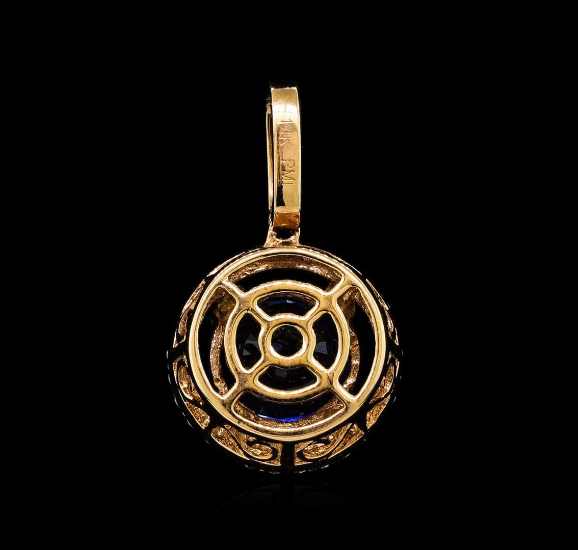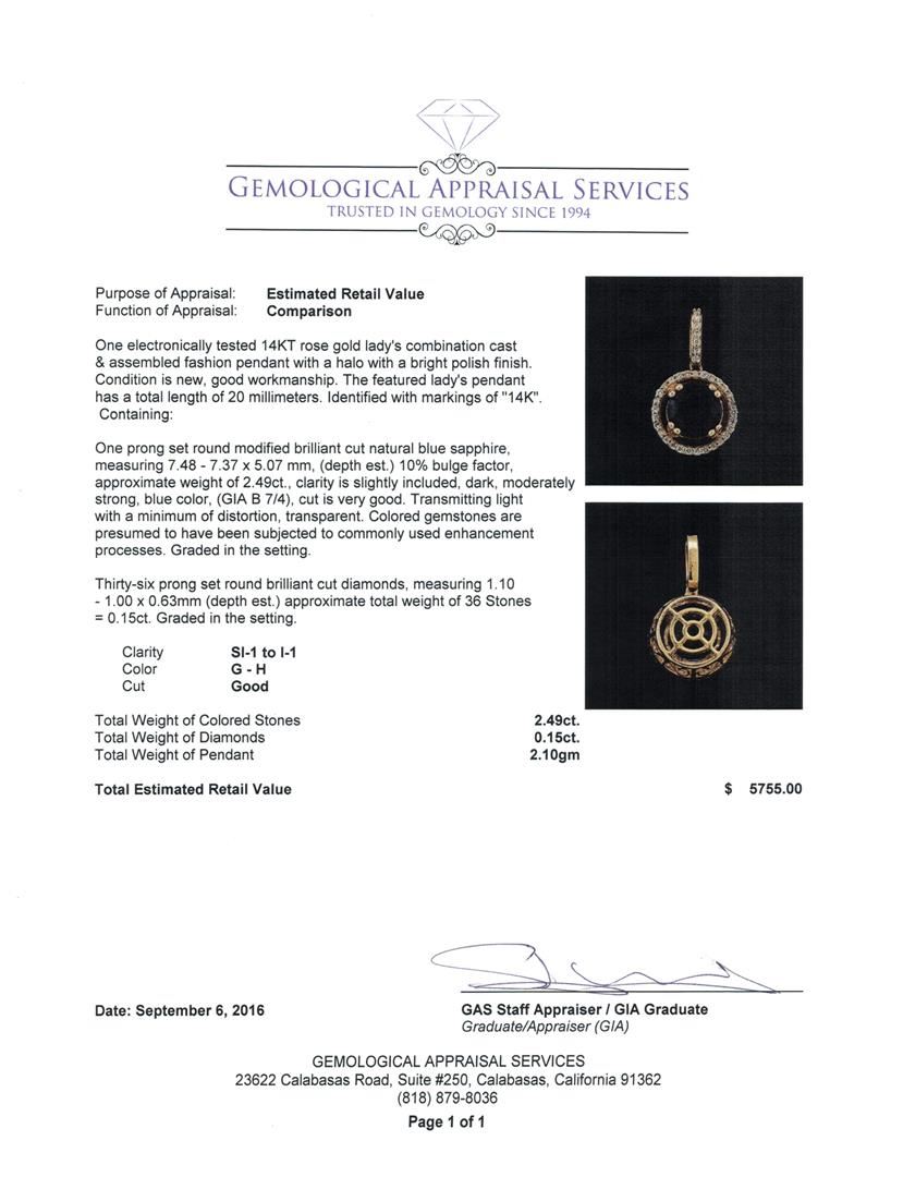 One electronically tested 14KT rose gold lady's combination cast & assembled fashion pendant with a halo with a bright polish finish. The featured lady's pendant has a total length of 20 millimeters. Identified with markings of '14K'. Condition is new, good workmanship. Containing: One prong set round modified brilliant cut natural blue sapphire, measuring 7.48 - 7.37 x 5.07 mm, (depth est.) 10%. bulge factor, approximate weight of 2.49ct., clarity is slightly included, dark, moderately strong, blue color, (GIA B 7/4), cut is very good. Transmitting light with a minimum of distortion, transparent. Colored gemstones are presumed to have been subjected to commonly used enhancement processes. Graded in the setting. Thirty-Six prong set round brilliant cut diamonds, measuring 1.10 - 1.00 x 0.63mm (depth est.) approximate total weight of 36 Stones = 0.15ct. Graded in the setting. Clarity SI-1 to I-1. Color: G - H Cut Good. Total Weight of Colored Stones 2.49ct.. Total Weight of Diamonds 0.15ct.. Total Weight of Pendant 2.10gm GAS Appraised at $5,755.00.