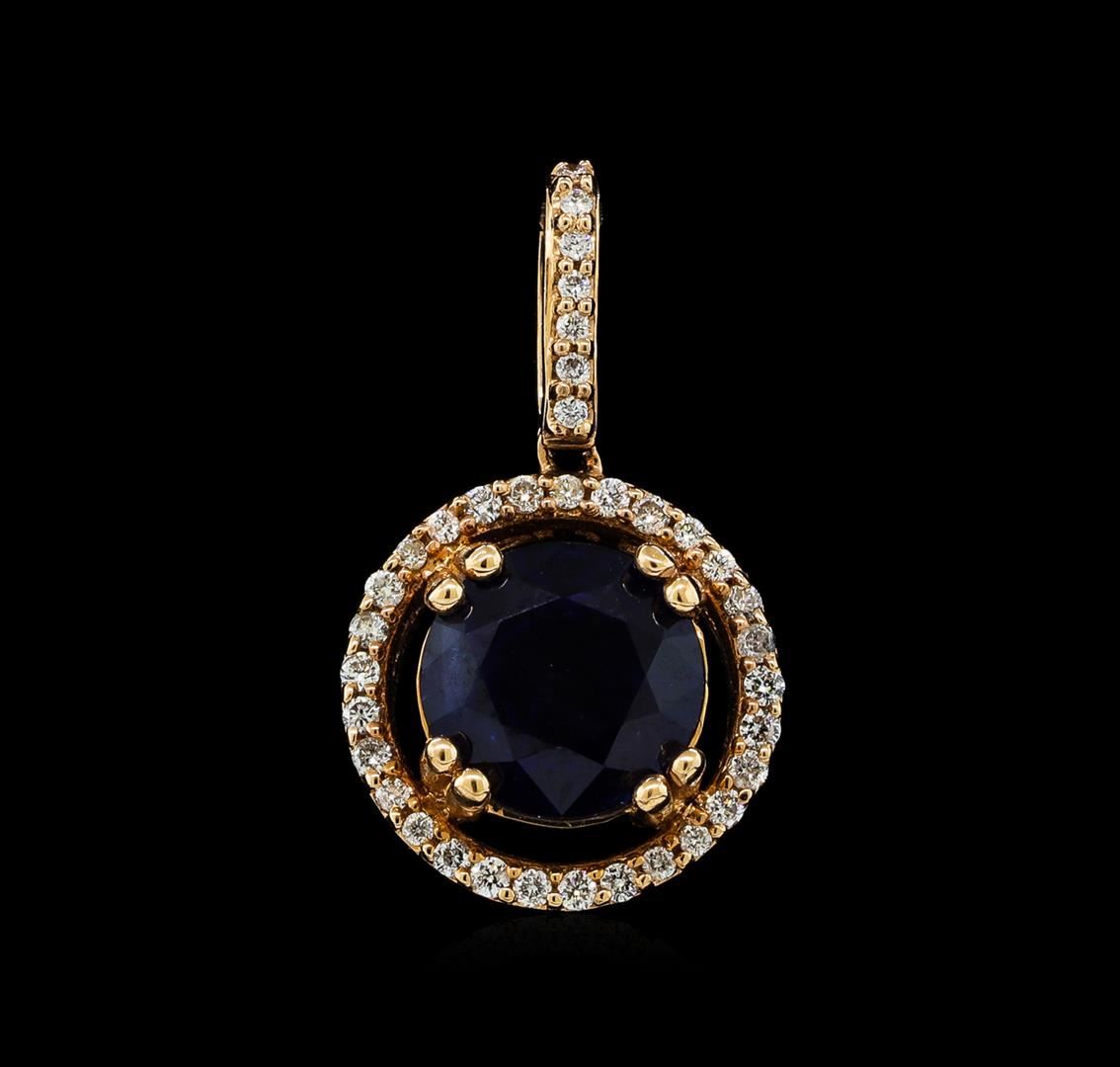 One electronically tested 14KT rose gold lady's combination cast & assembled fashion pendant with a halo with a bright polish finish. The featured lady's pendant has a total length of 20 millimeters. Identified with markings of '14K'. Condition is new, good workmanship. Containing: One prong set round modified brilliant cut natural blue sapphire, measuring 7.48 - 7.37 x 5.07 mm, (depth est.) 10%. bulge factor, approximate weight of 2.49ct., clarity is slightly included, dark, moderately strong, blue color, (GIA B 7/4), cut is very good. Transmitting light with a minimum of distortion, transparent. Colored gemstones are presumed to have been subjected to commonly used enhancement processes. Graded in the setting. Thirty-Six prong set round brilliant cut diamonds, measuring 1.10 - 1.00 x 0.63mm (depth est.) approximate total weight of 36 Stones = 0.15ct. Graded in the setting. Clarity SI-1 to I-1. Color: G - H Cut Good. Total Weight of Colored Stones 2.49ct.. Total Weight of Diamonds 0.15ct.. Total Weight of Pendant 2.10gm GAS Appraised at $5,755.00.
