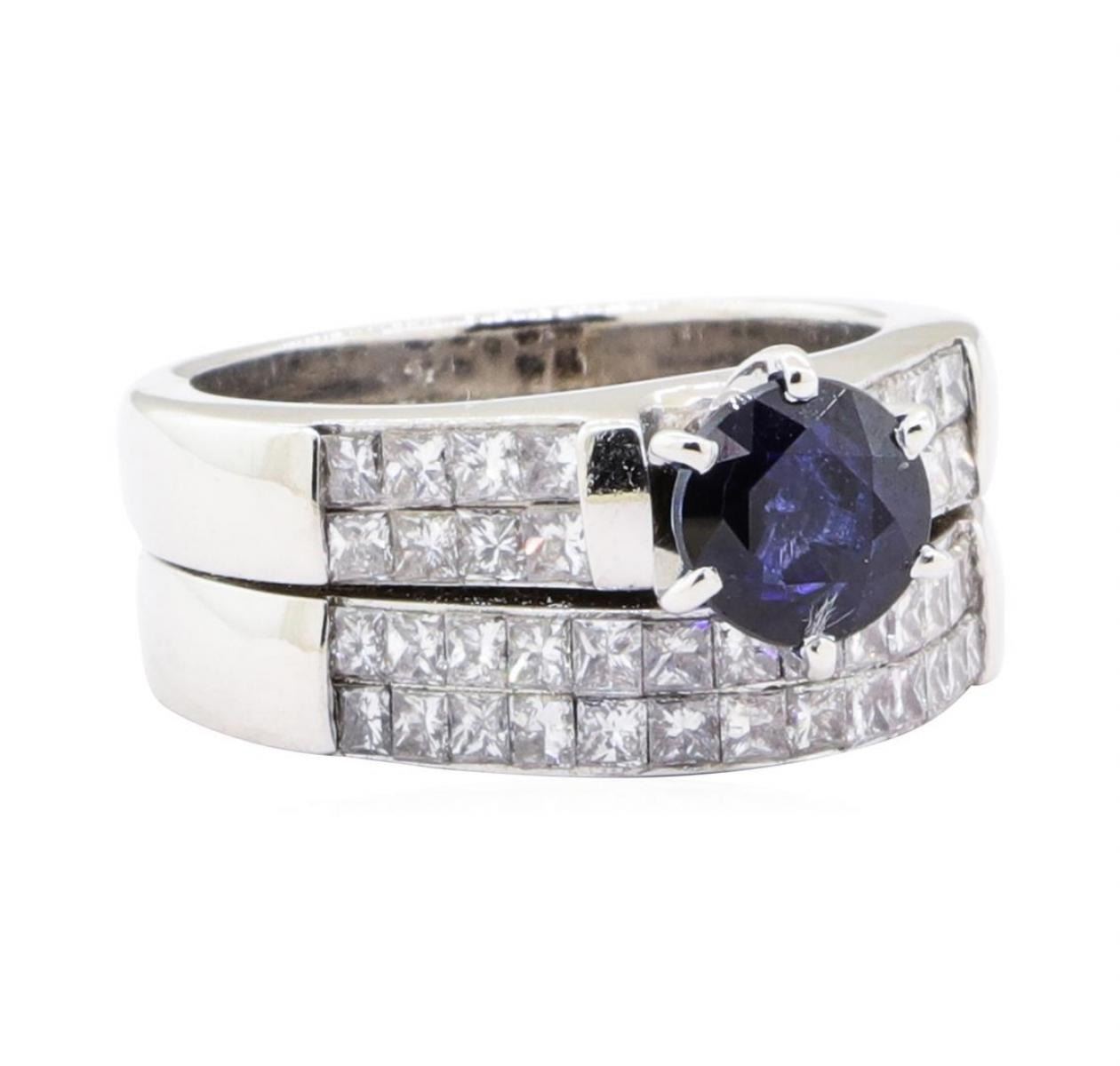 One set electronically tested 18KT white gold lady's combination cast & assembled fashion ring and attached band with a cathedral shank with a bright polish finish. The featured lady's ring has a double shank measuring 6.00 millimeters wide. Identified with markings of '18K'. Condition is Good. Containing: One prong set round modified mixed cut natural blue sapphire, measuring 5.95 - 5.85 x 3.84 mm, (depth est.) 8%. bulge factor, approximate weight of 1.19ct., clarity is eye clean, dark, moderately strong, blue color, (GIA B 7/4), cut is good. Transmitting light with no distortion, transparent. Colored gemstones are presumed to have been subjected to commonly used enhancement processes. Graded in the setting. Forty-Two invisible set princess cut diamonds, measuring 1.70 x 1.65 x 1.24mm (depth est.) approximate total weight of 42 Stones = 1.30 ct. Graded in the setting. Color H - I Clarity SI-1 to SI-2 Cut Good. Total Weight of Colored Stones 1.19ct.. Total Weight of Diamonds 1.30 ct.. Total Weight of Ring And Attached Band 10.30gm GAS Appraised at $5520.00. GAS Appraised.
