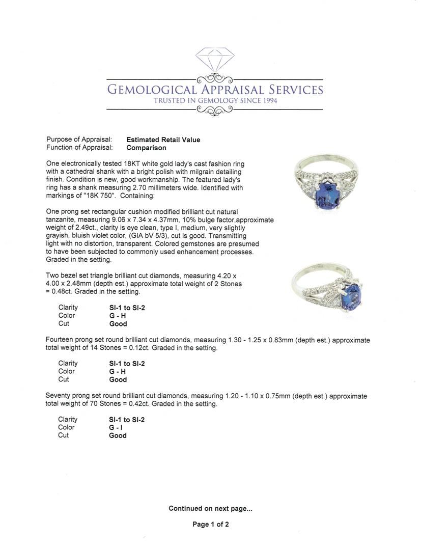 One electronically tested 18KT white gold lady's cast fashion ring with a cathedral shank with a bright polish with milgrain detailing finish. The featured lady's ring has a shank measuring 2.70 millimeters wide. Identified with markings of "18K 750". Condition is new, good workmanship. Containing: One prong set rectangular cushion modified brilliant cut natural tanzanite, measuring 9.06 x 7.34 x 4.37mm, 10% bulge factor, approximate weight of 2.49ct., clarity is eye clean, type I, medium, very slightly grayish, bluish violet color, (GIA bV 5/3), cut is good. Transmitting light with no distortion, transparent. Colored gemstones are presumed to have been subjected to commonly used enhancement processes. Graded in the setting. Two bezel set triangle brilliant cut diamonds, measuring 4.20 x 4.00 x 2.48mm (depth est.) approximate total weight of 2 Stones = 0.48ct. Graded in the setting. Clarity: SI-1 to SI-2. Color: G - Good Fourteen prong set round brilliant cut diamonds, measuring 1.30 - 1.25 x 0.83mm (depth est.) approximate total weight of 14 Stones = 0.12ct. Graded in the setting. Clarity: SI-1 to SI-2. Color: G - Good Seventy prong set round brilliant cut diamonds, measuring 1.20 - 1.10 x 0.75mm (depth est.) approximate total weight of 70 Stones = 0.42ct. Graded in the setting. Clarity: SI-1 to SI-2. Color: G - I. Cut Good. Total Weight of Colored Stones 2.49ct. Total Weight of Diamonds 1.02ct. Total Weight of Ring 6.80gm. GAS Appraised at $7,355.00.