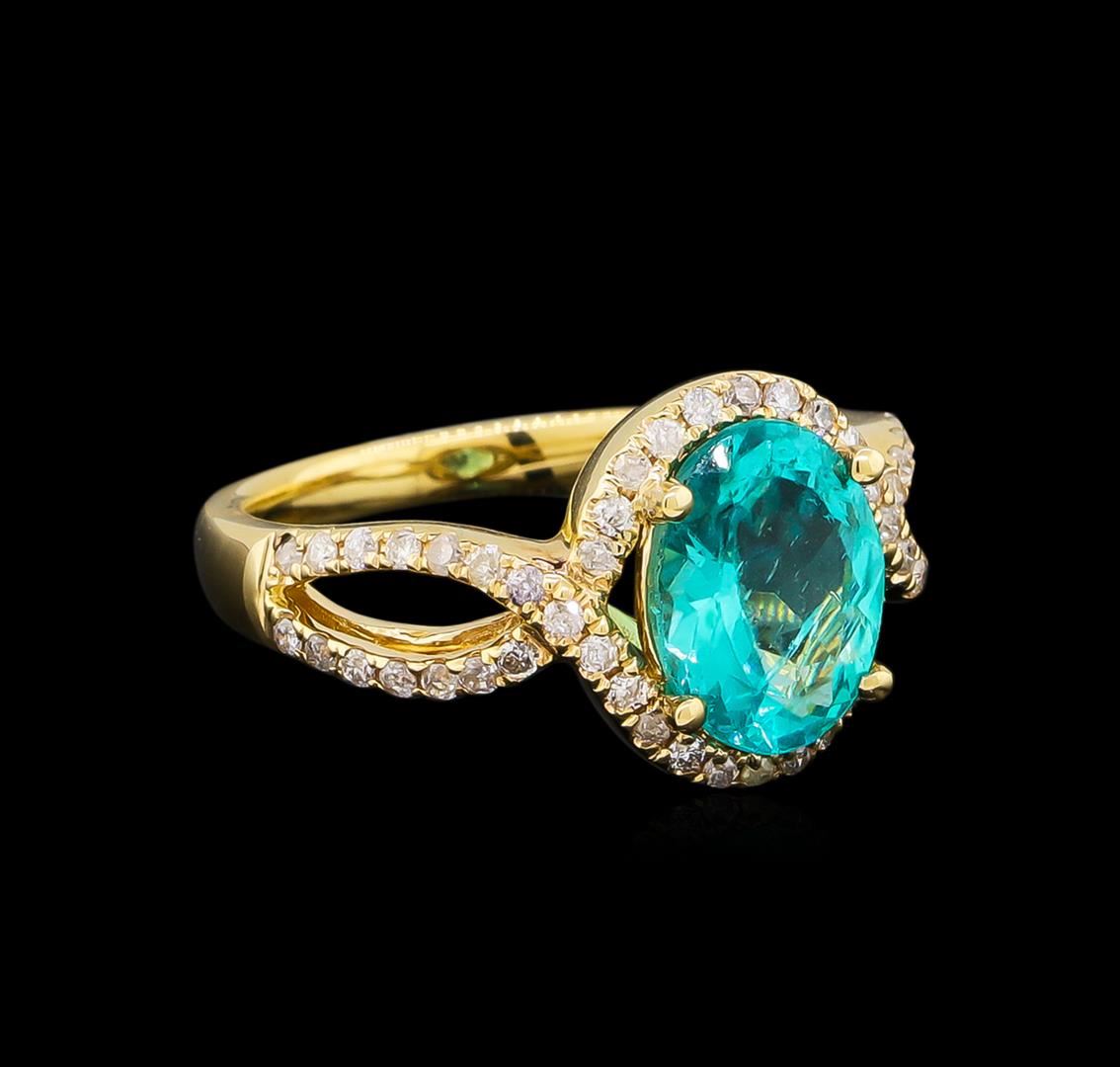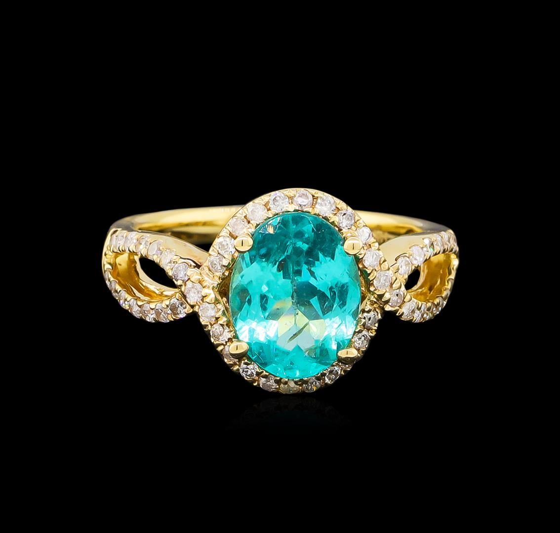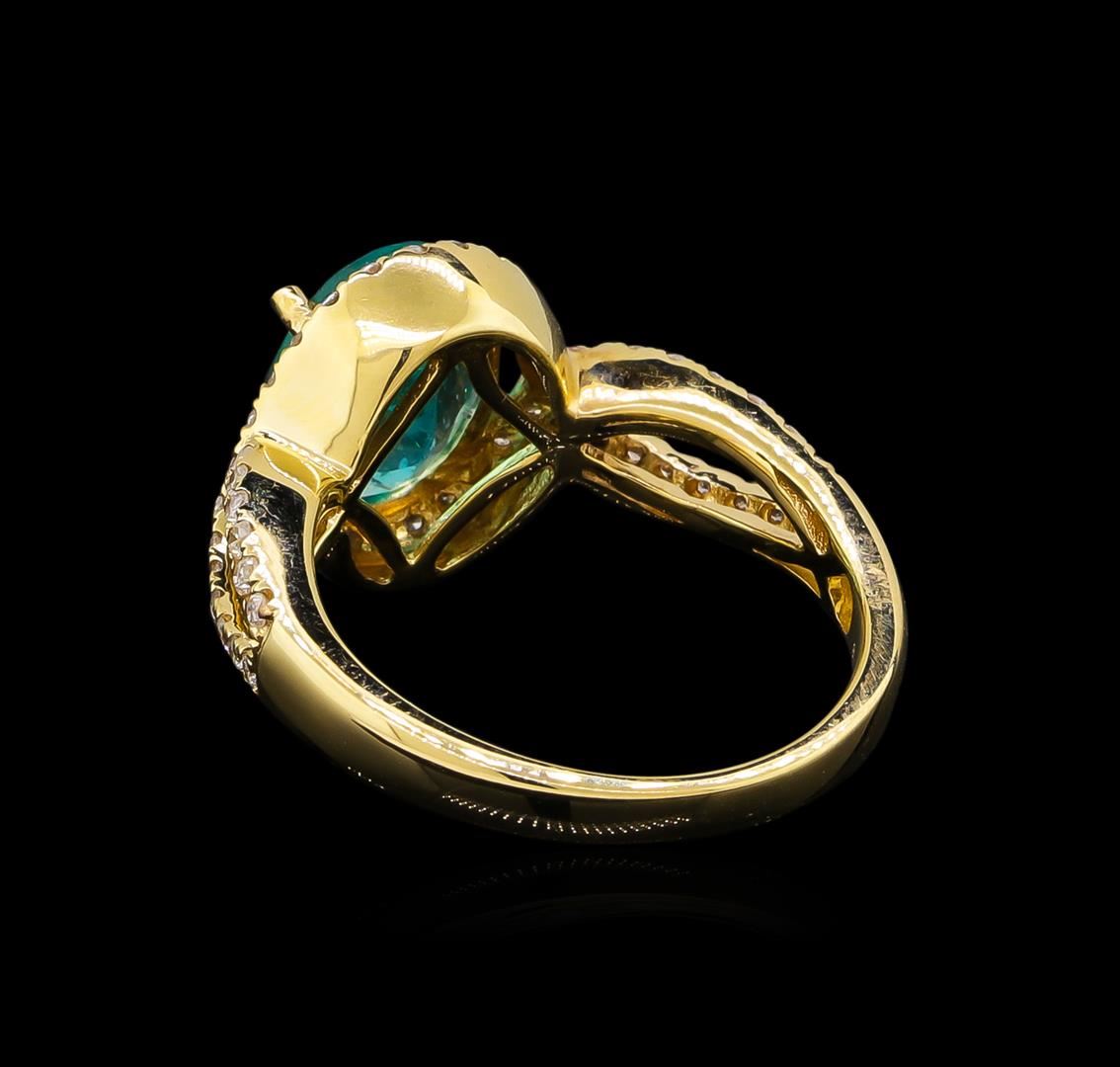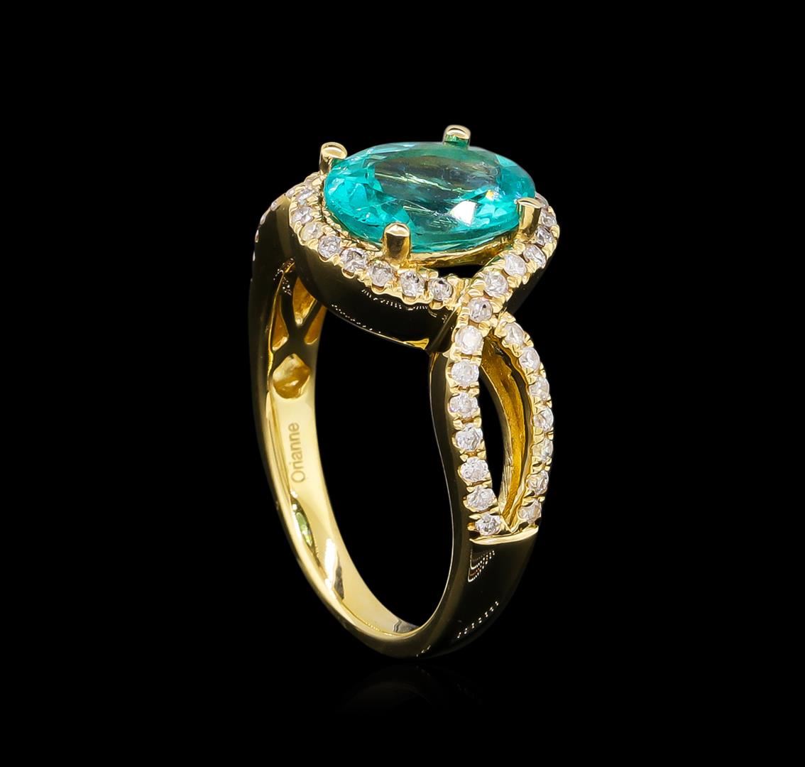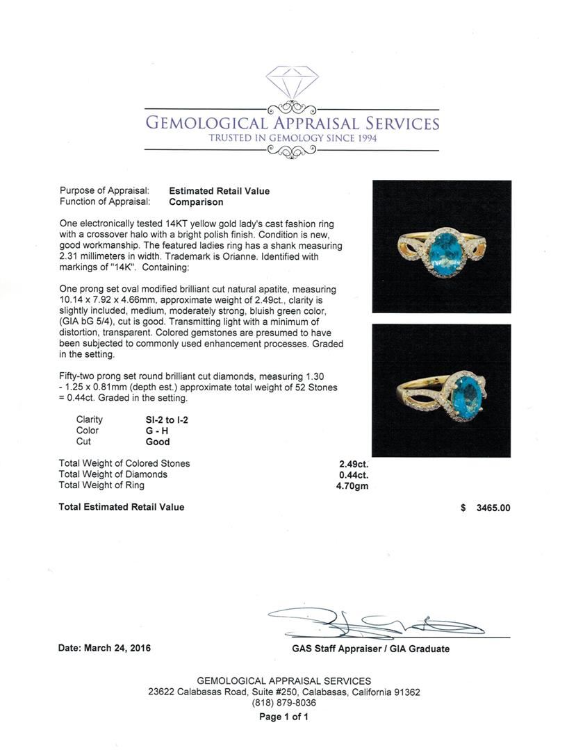 One electronically tested 14KT yellow gold lady's cast fashion ring with a crossover halo with a bright polish finish. The featured ladies ring has a shank measuring 2.31 millimeters in width. Trademark is Orianne. Identified with markings of "14K". Condition is new, good workmanship. Containing: One prong set oval modified brilliant cut natural apatite, measuring 10.14 x 7.92 x 4.66mm, approximate weight of 2.49ct., clarity is slightly included, medium, moderately strong, bluish green color, (GIA bG 5/4), cut is good. Transmitting light with a minimum of distortion, transparent. Colored gemstones are presumed to have been subjected to commonly used enhancement processes. Graded in the setting. Fifty-Two prong set round brilliant cut diamonds, measuring 1.30 - 1.25 x 0.81mm (depth est.) approximate total weight of 52 Stones = 0.44ct. Graded in the setting. Clarity: SI-2 to I-2. Color: G - Good. Total Weight of Colored Stones 2.49ct. Total Weight of Diamonds 0.44ct. Total Weight of Ring 4.70gm. GAS Appraised at $3,465.00.